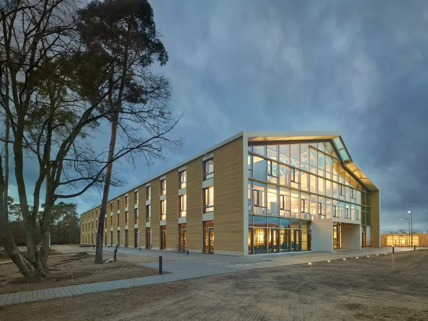 Die Biomarktkette Alnatura hat auf einem früheren Militärareal ihren neuen Firmensitz gebaut. Der dreistöckige Neubau mit den Architekten von HaasCookZemmrich ist Europas derzeit größtes Bürogebäude mit Lehmfassade, hochleistungsfähig, energieeffizient und mit optimiertem Innenkomfort aus recyclebaren bzw. natürlichen Materialien. Das Gebäude gliedert sich in die Bereiche Büro, Konferenz und Restaurant. Bereits bei der Planung wurde darauf geachtet, dass passive Maßnahmen den Aufwand für technische Anlagen möglichst gering halten. Belüftet wird das Gebäude auf natürliche Weise; mit Wärme und Kälte versorgt es sich geothermisch über Erdsonden; Photovoltaik auf dem Dach erzeugt elektrische Energie. Auch die graue Energie des Neubaus wurde wissenschaftlich evaluiert. Angestrebt ist die DGNB-Zertifizierung „PLATIN“.