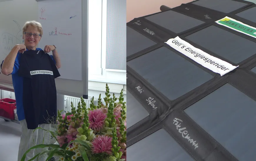 Urgestein könnte man sie nennen, aber Geli ist nicht aus Stein, sondern ein Mensch mit Herz, gern unterwegs und draußen und eine Freundin der Umwelt. Touren mit ihrem bereits vorhandenen elektrisch unterstützten Fahrrad kann sie nun mit Solarpower vornehmen. Für ein leistungsfähiges faltbares Panel mit passendem Ladegerät, beides nicht schwer, also dafür geeignet mitgenommen zu werden, haben die Kollegen zusammengelegt und bauen darauf, dass es ihr nachhaltig Freude im Unruhestand macht.