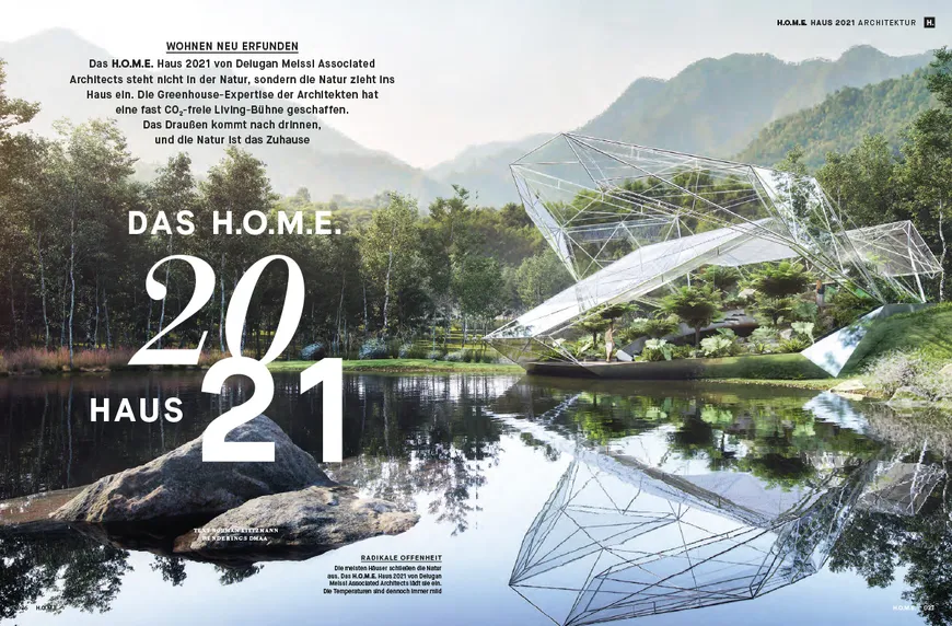 Das Magazin H.O.M.E. hat die Architekten DMAA Delugan Meissl Associated Architects beauftragt, ein Master-Haus zu planen und zu entwerfen. Thomas Auer von Transsolar hat zu den Themen Klima und Energie beraten. Ziel war ein „Master-Case“ für modernes Wohnen in nachhaltiger Architektur – ohne Restriktionen und frei von Sachzwängen zu schaffen. Zukunftsfragen zu den Themen Nachhaltigkeit, CO2- und Geoneutralität werden aber in dem futuristischen Bauwerk berücksichtigt.