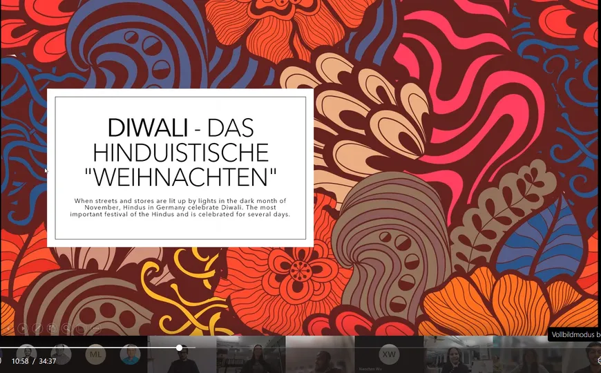 Dafür wurde der „Knowledge Potluck“ ins Leben gerufen - die erste Sitzung war am 14. Dezember. Jeder Referent hatte 2-3 Minuten Zeit, um etwas aus seinem Herkunftsland zu präsentieren. Die Redner für unsere erste Session waren Ana Diaz, Ketan Avhad, Luke Kencana, Michelle Hur und Francis Fotsing. Die Vielfalt der Themen reichte von der Maya-Zivilisation und kiloschweren Gummibällen, dem farbenprächtigen Diwali-Fest, der riesigen Nationalblume Indonesiens mit Aasgeruch, einer persönlichen Bedeutung der Weihnachtszeit und Fernweh-schürende frische Eindrücke einer Reise nach Tansania.