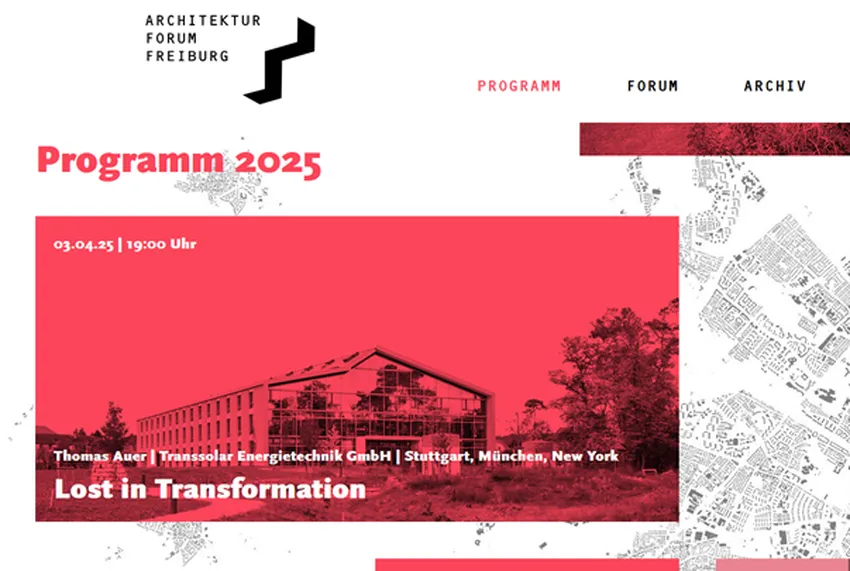 Thomas Auer hält am Donnerstag den 3. April in Freiburg einen Vortrag mit dem Titel Lost in Transformation "Der Klimawandel erfordert eine nachhaltige und klimaresiliente Transformation der gebauten Umwelt inklusive einer Dekarbonisierung des Gebäudesektors und des Bauwesens. Gebäude verbrauchen im Betrieb häufig mehr Energie als prognostiziert und/oder erreichen nicht die avisierte Aufenthaltsqualität. Dies ist nicht zuletzt auf die Komplexität der Gebäude zurückzuführen."