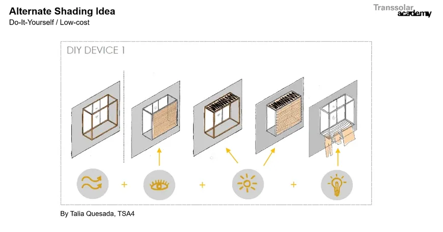 Ein horizontal angebrachter fester Sonnenschutz über den Fenstern kann ab ca. 10 Uhr vor zu viel Einstrahlung schützen. Alternativ wurde eine Möglichkeit aufgezeigt, die im persönlichen Projekt eines früheren Jahrgangs der Academy von Talia Quesada entworfen wurde: Ein vor das Fenster gesetzter, kastenförmiger Sonnen- und Sichtschutz mit integriertem Wäschetrockner. Eine robuste Lösung die kostengünstig vor Ort aus lokal verfügbarem Material gefertigt werden kann.