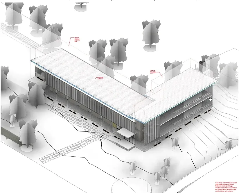 Ein letztes virtuelles Treffen des gesamten Teams begann mit der Information über ein Designupdate. Der Entwurf des Traktes mit den Waschräumen und Toiletten wurde geändert, um ihn zu vereinfachen und alle Installationen von einer Seite aus zugänglich zu haben. Statt der äußeren Mauer mit den Durchbrüchen ist nun eine geschlossene Wand mit einem hoch angesetzten Durchbruch auf ganzer Breite als Lichtschlitz auf der Südseite sowie gegenüber einer offenen Seite vorgesehen.