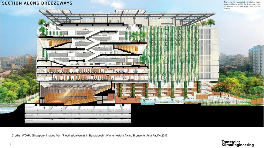 Das 2024 fertiggestellte Gebäude der BRAC-University von WOHA Architects besitzt zukunftsorientierte, innovative hybride Kühlung und Wolfgang Keßling ist einer der maßgeblichen Mitgestalter des Konzepts.