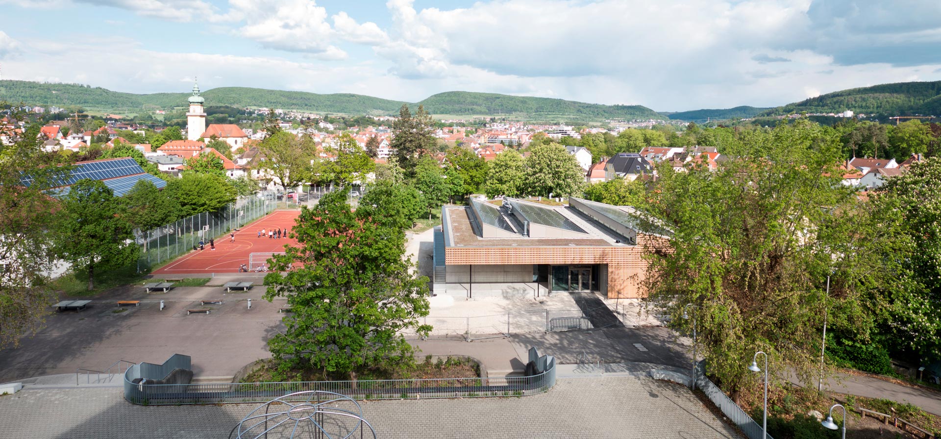 Der Neubau des Fachklassentraktes am Schubart-Gymnasium in Aalen wurde als Nullenergiegebäude konzipiert. Das heißt, dass auf Basis einer Primärenergiebilanz über das Jahr mindestens so viel Energie lokal und regenerativ erzeugt wird wie der Neubau verbraucht. Die Bilanz umfasst hierbei nicht nur den Gebäudebetrieb für Heizen, Lüften und Beleuchten, sondern weitergehend ebenso Energiemengen für den Nutzerstrom. Eine weitere Besonderheit bei diesem Projekt ist die ganzheitliche Betrachtung des Themas Dämmung. Detaillierte Simulationen haben gezeigt, dass das Energieeinsparpotential von zusätzlicher Dämmung nur gering ist, wohingegen der Kostenmehraufwand sehr hoch ist. Daher wurde keine Passivhausqualität realisiert, sondern lediglich ein guter Dämmstandard. Das Ziel hat sich im Planungsprozess weg von einem Passivhaus hin zu einem „Aktivhaus“ verändert.