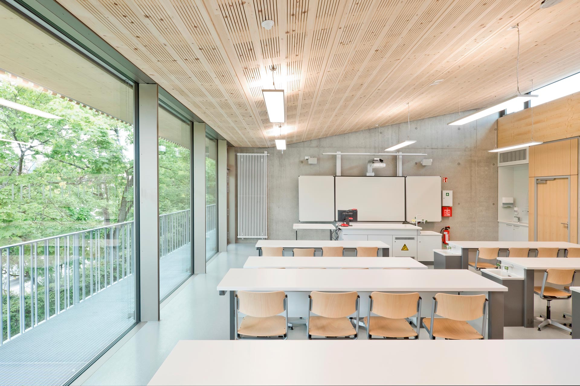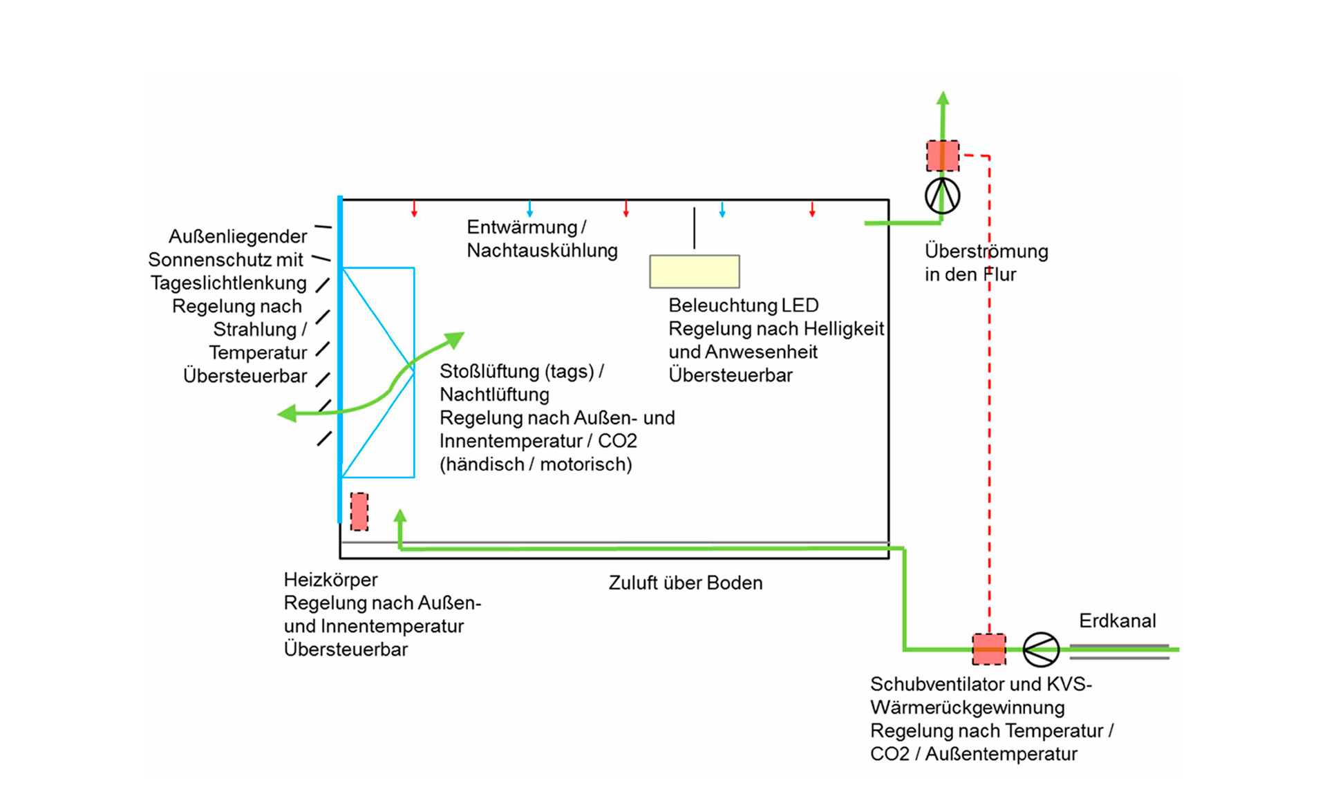 Das Klimakonzept sieht ein hybrides Lüftungssystem aus einer sogenannten Schublüftung in Kombination mit Fensterlüftung vor. Die Luftmenge, welche über die Lüftung in die Klassenzimmer eingebracht wird ist eine Grundlüftung, die durch Stoßlüften in den Pausen unterstützt werden muss. Durch die Kombination aus beiden Strategien ist eine gute Luftqualität gewährleistet.