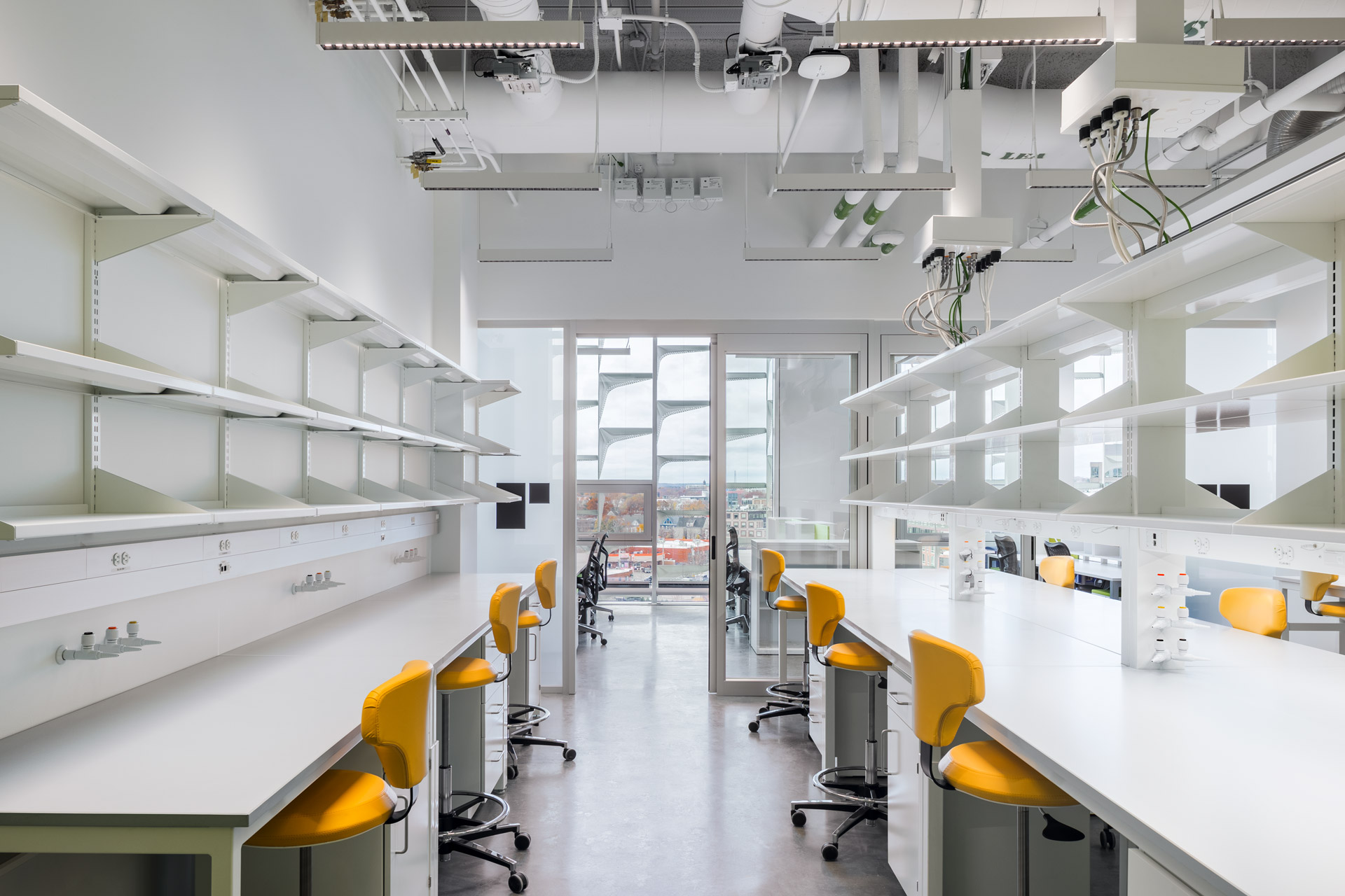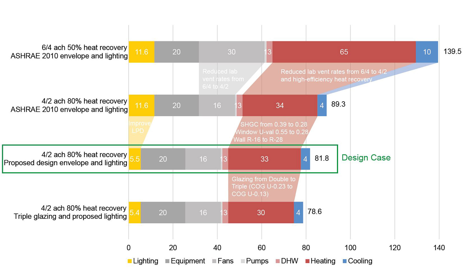 Um den Energieverbrauch in den Laboren zu minimieren, plädierte das Planungsteam für eine detaillierte Risikobewertung, um die Labore mit möglichst geringen Luftwechselraten betreiben zu können, wobei Transsolar umfangreiche Studien zum Einfluss der Lüftungsrate auf den Energieverbrauch durchführte. Für fast alle Luftströme wird eine hocheffiziente Wärmerückgewinnung mit indirekter adiabater Abluftkühlung eingesetzt. Als Ergebnis dieses hochmodernen Labordesigns wurde der jährliche Energieverbrauch auf 261 kWh/m² (83 kBtu/sf) prognostiziert, was einer Reduzierung der CO2-Emissionen um 40 % gegenüber einem ASHRAE 90.1-2010-Basisgebäude entspricht.