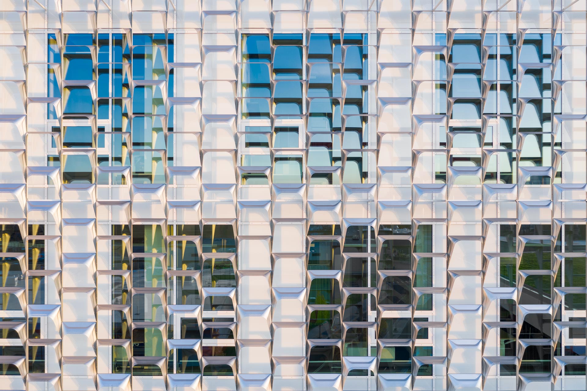 Das Fassadenkonzept konzentriert sich auf eine außergewöhnlich gute Tageslichtversorgung und eine natürliche Belüftung, was in Laborgebäuden eine besondere Herausforderung darstellt. Sowohl der äußere Sonnenschutz, der die Forschungsboxen im Obergeschoss umgibt, als auch die Terrassenüberstände im Sockelbereich wurden mit umfangreichen parametrischen Leistungsstudien für Sonnenschutz und Tageslichtversorgung in Abhängigkeit von der Ausrichtung und der jeweiligen Nutzung sorgfältig aufeinander abgestimmt. Um Wärmeverluste möglichst niedrig zu halten, ist die gesamte Verglasung in Dreifachglas ausgeführt.