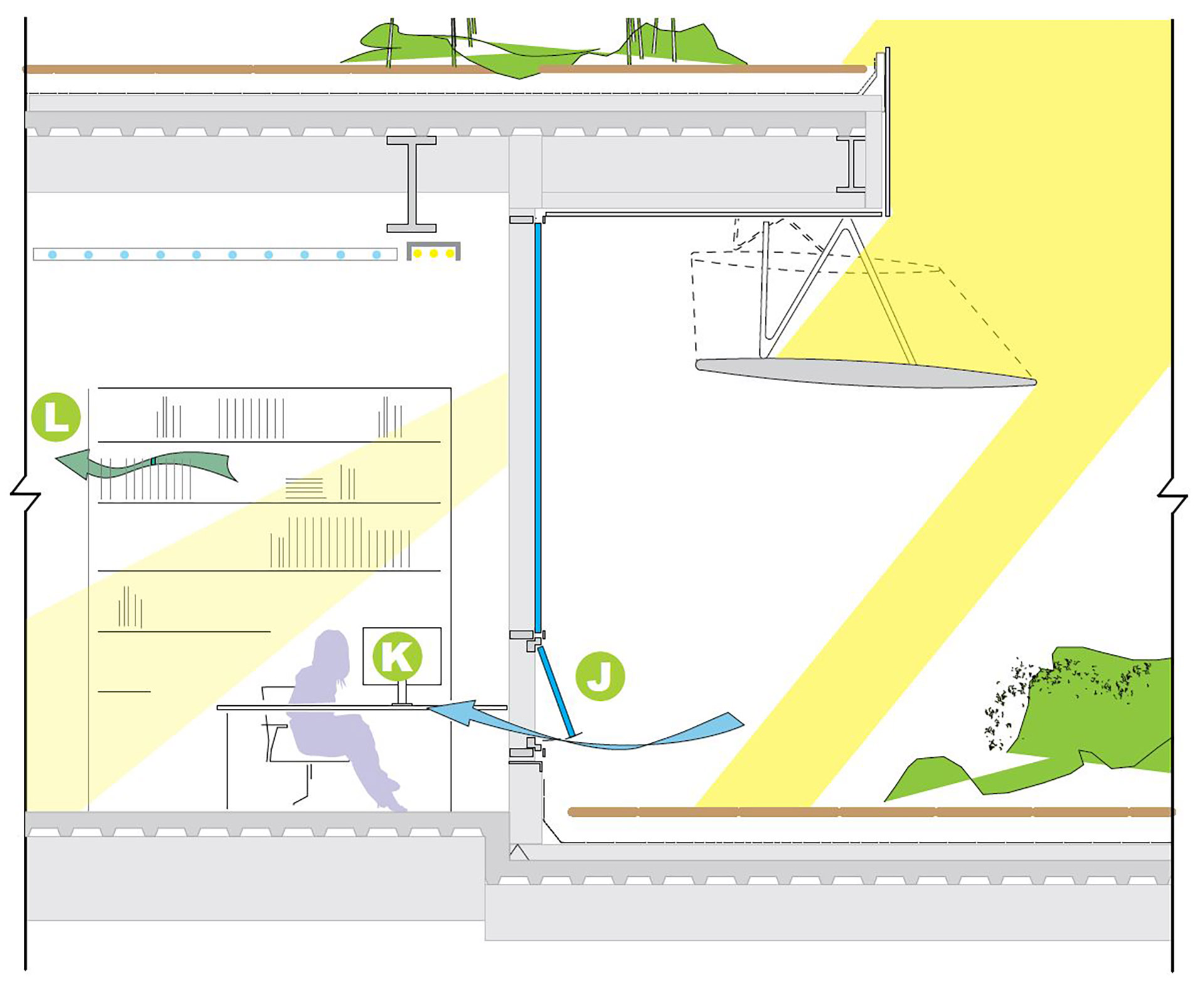 Alle Nicht-Laborräume, einschließlich der an die Labore angrenzenden Schreibräume, haben die Möglichkeit zur natürlichen Belüftung. Die gesamte Zuluft der Nicht-Laborräume durchströmt die beiden großen Atrien und dient danach als Ergänzungsluft für die Labore. So wirken die Schreibräume als Puffer zwischen Außenbereich und den Laborräumen.