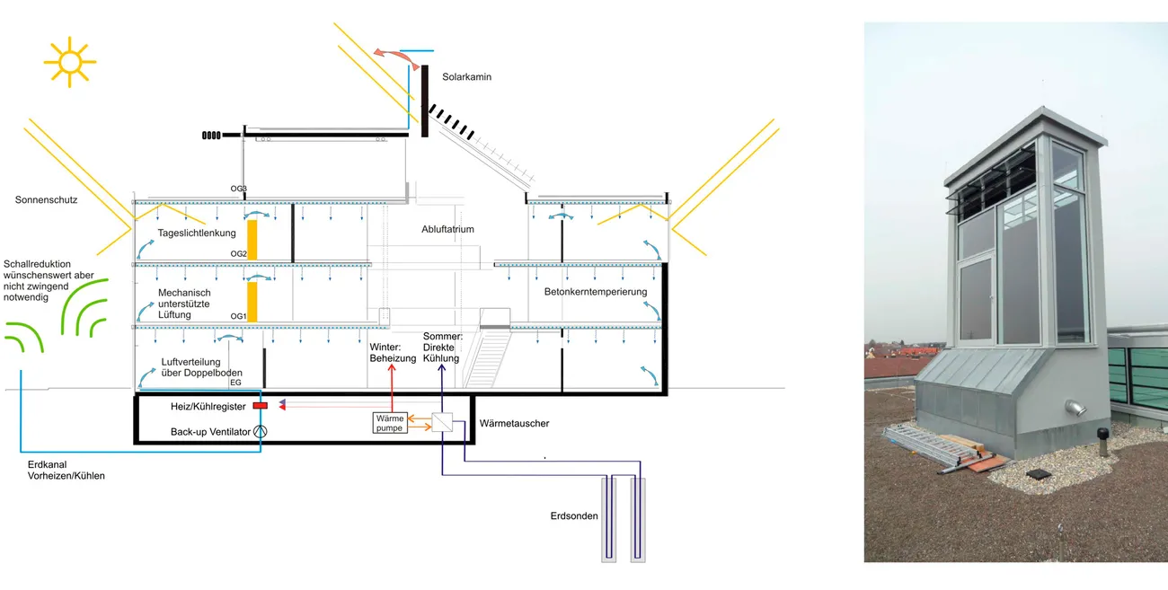 Die Frischluftzufuhr erfolgt über einen Erdkanal, der die Außenluft im Winter vorerwärmt und im Sommer vorkühlt. Die Abluft wird über das zentrale Atrium mittels eines Solarkamins abgeführt. Die Wärmerückgewinnung ist in den Solarkamin integriert, wodurch die Abwärme im Winter genutzt werden kann.