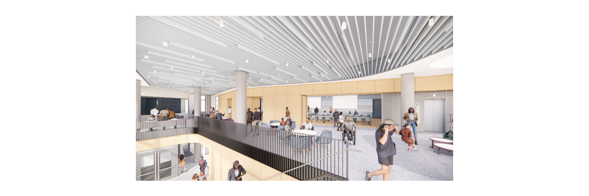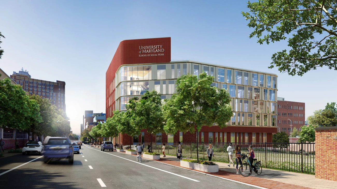 Der sechsgeschossige Neubau der University of Maryland School of Social Work (UMSSW) ist als offenes Haus konzipiert, das Lehre, Forschung und Austausch fördert und zugleich als Schnittstelle zwischen Universität und umgebendem Stadtraum wirkt. Die Architektur schafft hierfür vielfältige Lern‑ und Begegnungsräume, darunter zeitgemäße Lehr‑ und Forschungsflächen, gemeinschaftliche Aufenthaltsbereiche, eine Café‑Lounge sowie Infrastruktur für aktive Mobilität wie Fahrradabstellplätze und Duschen. Ein besonderes Augenmerk liegt dabei auf Zugänglichkeit, sozialer Offenheit und der langfristigen Nutzungsflexibilität des Gebäudes.