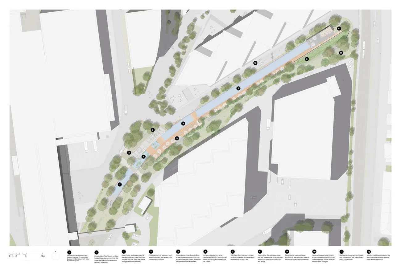 Der Gleispool ist ein Pionierprojekt für multifunktionalen urbanen Raum, der eine Schwimminfrastruktur zur Verfügung stellt und Grünflächen ermöglicht. Als Naturbad mit einer 170 Meter langen Schwimmbahn sorgt der Gleispool an heißen Sommertagen zugleich für Kühlung der heutigen Hitzeinsel. Als erste Intervention begrünt und kühlt er den bislang stark versiegelten Verkehrsraum.