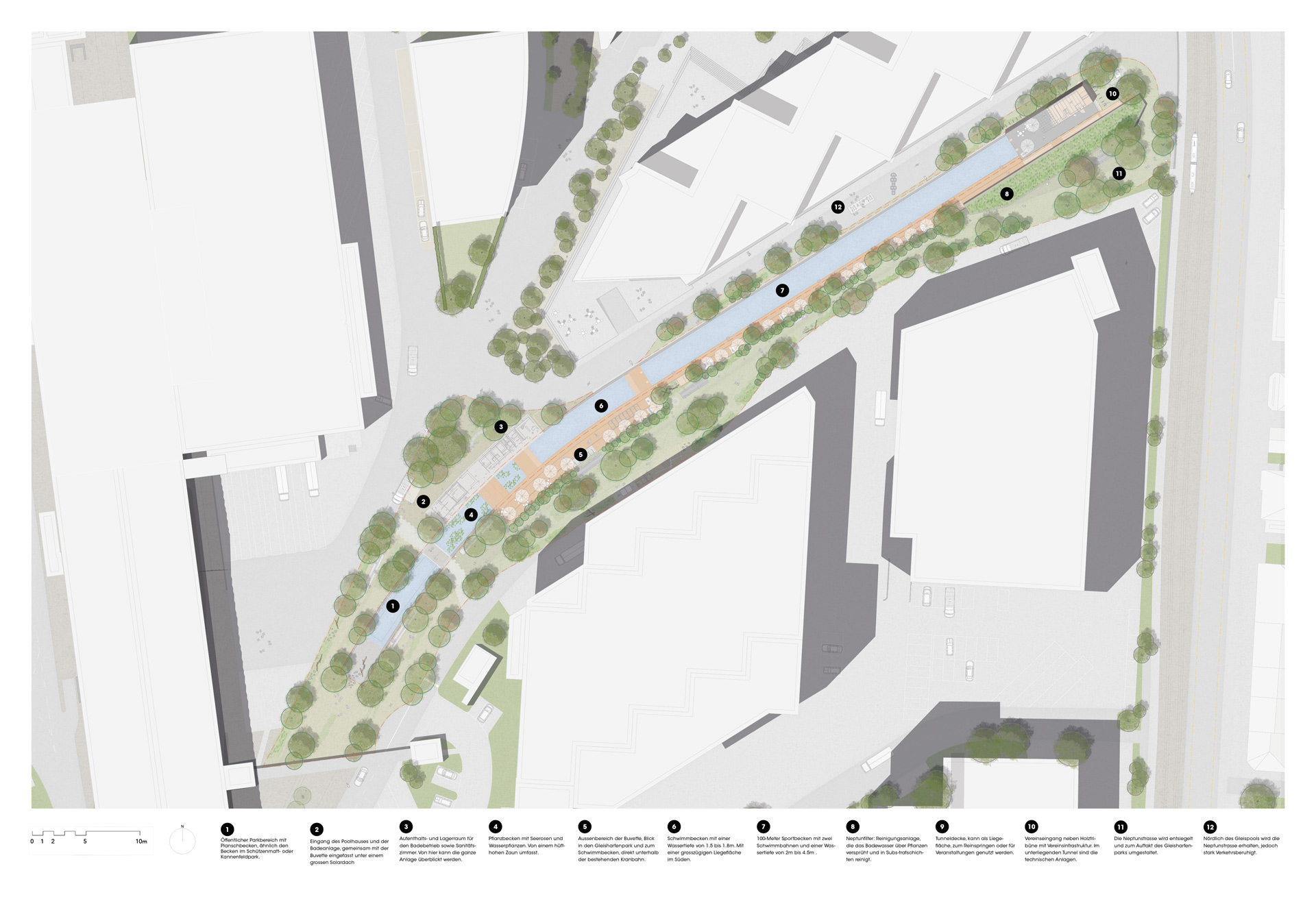 Die Wasserqualität der Schwimmanlage muss sichergestellt sein. Ein naturnahes System, das ohne Chemikalien auskommt und keine aufwendige Technik benötigt, reinigt mit einem am Boden der ehemaligen Bahnrampe gelegenen Sedimentfilter das Wasser von Feststoffen, bevor es zu einer Filteranlage gepumpt und danach über Steine und intensive Begrünung versprüht wird. So wird es sich auch von letzten Verunreinigungen befreit, bevor es zurück in das Becken geleitet wird.