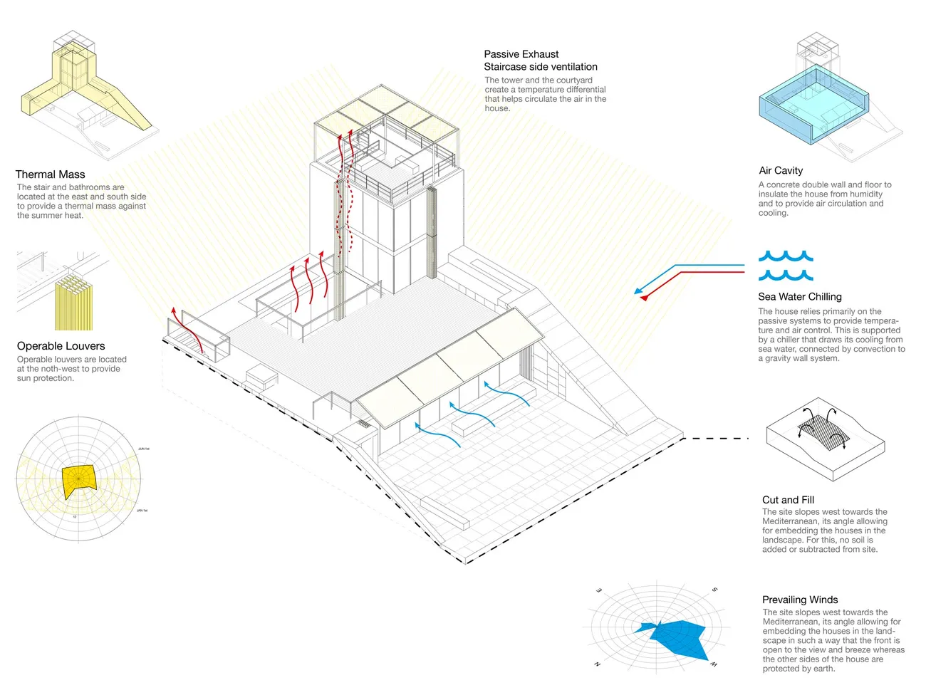 An der Küste von Aamchit entstanden vier neue hochwertige Einfamilienhäuser. Der Böschungswinkel des Standorts erlaubt es, die Häuser so in die Landschaft einzubetten, dass die Vorderseite nach Westen zum Meer hin freie Aussicht hat, eine Brise eintreten kann, der Boden aber die anderen Seiten des Hauses schützt. Die Häuser besitzen eine doppelwandige Mauer in U-Form, die im Westen offen ist, im Osten als Stütze gegen den Boden wirkt und im Norden und Süden parallel zur Böschung keilförmig abfällt. Sie isoliert und hält Bodenfeuchtigkeit ab und macht es möglich, kühle Luft in das Haus zu bekommen, was den Energiebedarf zur Kühlung senkt. Im Zwischenraum der doppelten Mauer ist auch Gebäudetechnik untergebracht, das Erdgeschoss bleibt so als Wohnraum erhalten. Der hintere östliche Teil ist als Hof gebaut, ermöglicht gute Querlüftung und schafft ein Mikroklima gegen extreme Wetterlagen. Die südöstliche Seite des Hofes ist strategisch als Turm ausgelegt und beeinflusst das Raumklima: Er schirmt den Hof gegen Osten und Süden von der Sonne ab, es entsteht ein Temperatur- und Luftdifferential und damit natürliche Luftbewegung im Haus. Der Turm wirkt als Kamin und führt passiv die heiße Luft ab. Treppe und Badezimmer sind auf der Ost- und Südseite des Turms angeordnet und bieten thermische Masse gegen die Sommerhitze. Der Winkel im Nordwesten ist nicht weiter strukturiert; die Zimmer verwandeln sich durch Öffnen der Fenster in Balkone. Diese Kombination von Hof und Turm stellt einen neuartigen Haustypus dar. Weitere Systeme unterstützen die Courtower-Klimastrategie: Ein Gravivent-Wärmetauschersystem kühlt passiv die Räume im Haus. Das mit Schwerkraft betriebene System ist in die Schränke der Zimmer eingebaut. Die Kälte dafür liefert eine Wärmepumpe, die an der Primärseite an kühles Meerwasser angeschlossen ist. Bei Bedarf führt eine mechanische Anlage Frischluft über einen Erdkanal zu, der sie vorkonditioniert. Die Mauern sind mit hellem lokalen Naturstein verkleidet; hölzerne Läden schützen die Fenster vor der Sonne, lassen wenig Strahlungswärme herein und schaffen ein pufferndes Luftkissen. An der Westfassade verzögert ein Baldachin aus Segeltuch den Eintritt von direktem Sonnenlicht in das Haus bis in den Nachmittag hinein und erzeugt über der Hauptfassade einen Luftspoilereffekt.