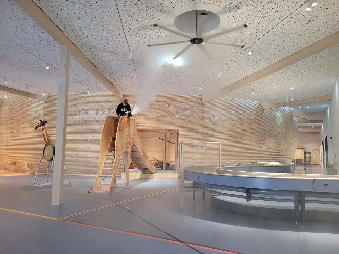 Bei der Realisierung des Mitmach-Museums als Dauerausstellung wurde auf Nachhaltigkeit geachtet. Die ehemalige Markthalle blieb weitgehend unverändert, das ist gut für einen geringen ökologischen Fußabdruck. Für den inneren Neubau ist heimisches Fichtenholz das dominierende Material der Tragkonstruktion, der Wände und Decken. Wo der Boden nicht aus Holz ist, hat er einen robusten Belag aus Kautschuk.