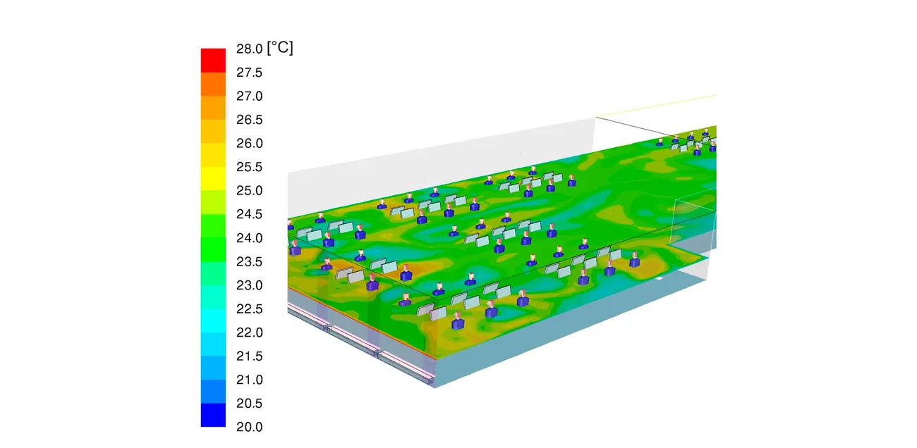 Zum Einsatz kamen dabei neben der dynamischen thermischen Gebäudesimulation auch eingehende Strömungsanalysen (CFD) sowie die dynamische Simulation des Tageslichts. Ferner wurde auch die zu erwartende CO2-Konzentration in den Arbeitsbereichen simuliert, um das Lüftungskonzept zu validieren und somit eine gute Raumluftqualität sicherzustellen. Für die Arbeitsbereiche im Atrium wurde ein dezentrales Konzept auf Basis lokaler Blendschutzmaßnahmen entwickelt. Die genaue Abstimmung der Fassadenqualität sowie Analyse der Eigen- und Umgebungsverschattung zeigten, wie die Anforderungen an thermischen Komfort und Energiebedarf im Atrium eingehalten werden können.