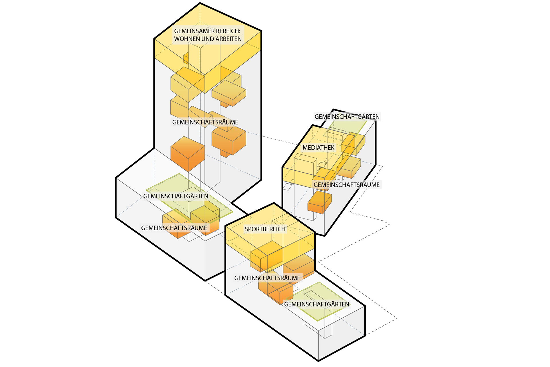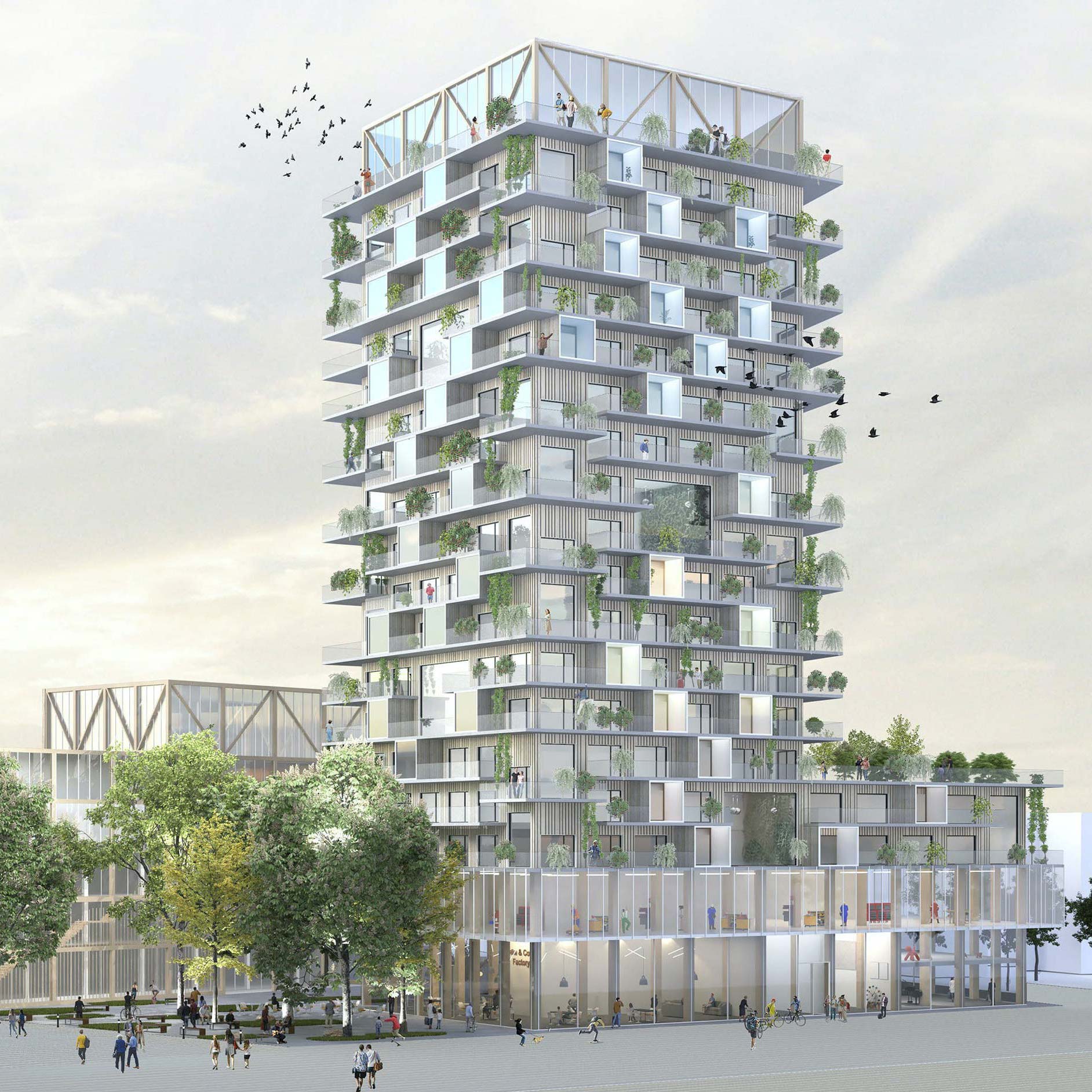 Das Areal soll offen und durchlässig werden. Damit es im Sommer in der Stadt kühl bleibt, wird der Innenhof begrünt. Gemeinschaftsgärten auf den Dächern der Gebäude und ein Wäldchen zum Bahnhof hin sind vorgesehen. Ein neuer Innenhof, „Stadtfoyer“ genannt, soll sich zwischen den Gebäuden erstrecken und von allen Seiten zugänglich sein. Mit Wasserspielen soll er als Treffpunkt werden und Bewohner, Kunden der Läden, Spaziergänger oder wartende Bus- und Bahnreisende zum Verweilen einladen.