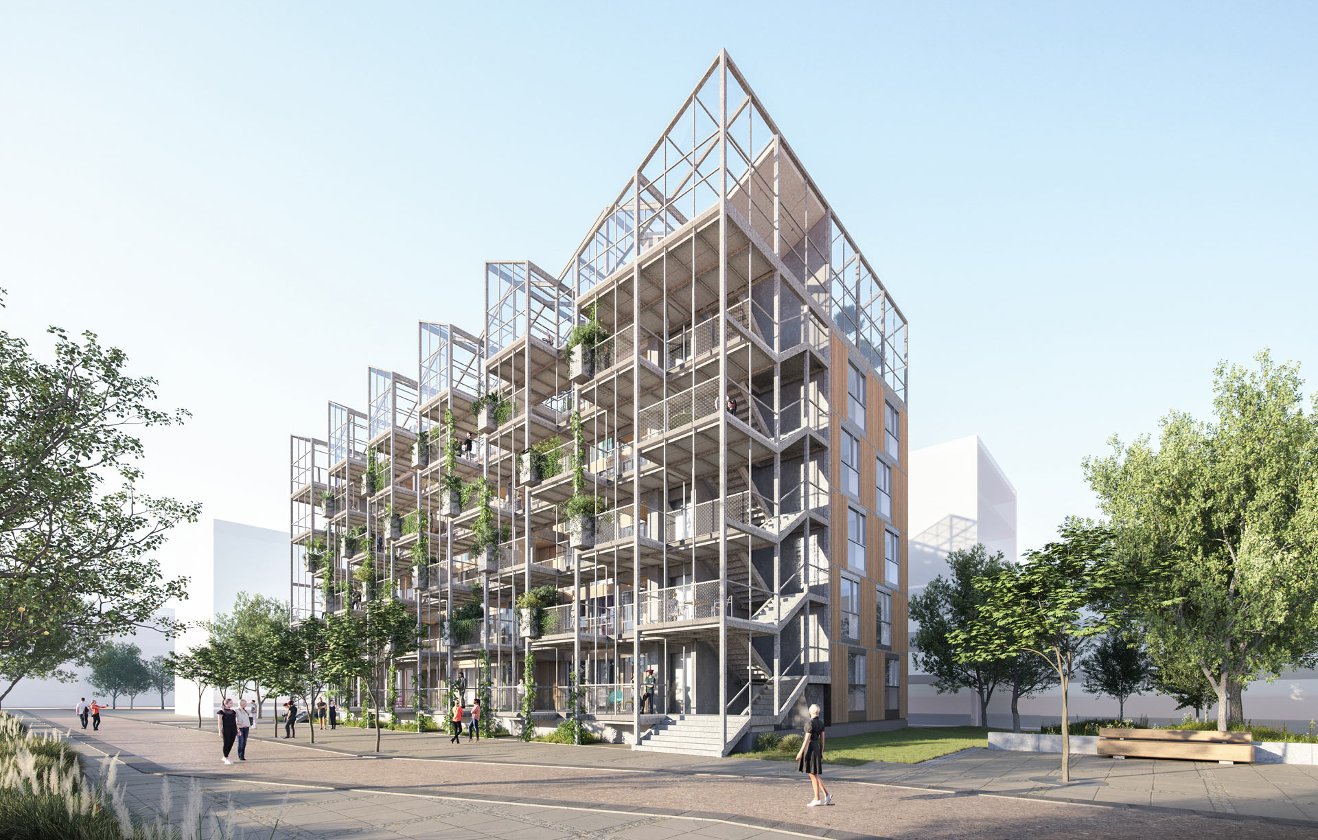 Basis des Gebäudes bildet der Wohnblock aus vorgefertigten Holzmodulen. Die daraus vor Ort zusammengefügten Wohneinheiten sind unterschiedlich groß und reichen von Zweizimmerwohnungen bis hin zu Familienwohnungen. Als Zugänge zu den ~25 Einheiten dienen die vorgesetzten offenen und begrünten Stahlbeton-Laubengänge. Sie verbinden die gemeinschaftlich genutzten Loggias und Freiflächen und ermöglichen auch Bepflanzung. Als Krone über den fünf Wohnungsebenen sitzt das Gewächshaus, das lokal ein Urban-Farming ermöglicht.
