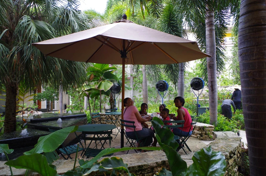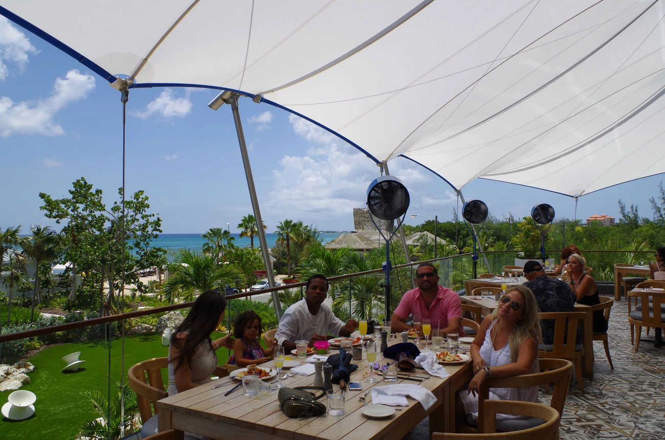 Verdunstungsventilatoren sind nichts Neues, aber die Ventilatoren, die in der Camana Bay und im Kimption Seafire Resort and Spa, einem Luxusresort am Strand, getestet wurden, sind anders: es sind Dry Mist-Ventilatoren. Die Kombination der Wörter "Dry" und "Mist" mag wie ein Widerspruch in sich wirken, aber die verwendete Technologie erzeugt einen Nebel, der sich trocken anfühlt. Wasser wird mit hohem Druck durch eine Düse mit einer sehr kleinen Öffnung gepresst. Der entstehende Nebel ist so fein, dass er schon kurz nach dem Austritt aus dem Gebläse verdunstet und sich aus einer Entfernung von bis zu einem Meter trocken anfühlt. Der Verdunstungsprozess senkt die Temperatur vor den Ventilatoren mit viel weniger Energie als die herkömmliche Luftkühlungstechnik.