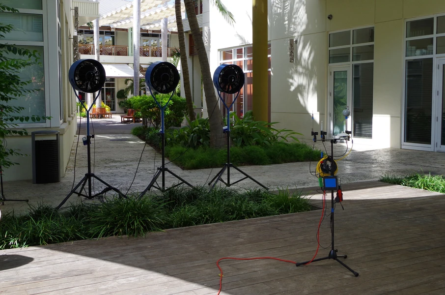 Auf Anfrage von Dart Development, wie der Außenkomfort in den Plätzen und Höfen von Camana Bay, einer lebhaften Hafenstadt auf den Cayman Islands, während der heißen und feuchten Sommermonate verbessert werden könnte, wurde von Transsolar vorgeschlagen, den thermischen Außenkomfort durch Dry Mist-Technologie zu verbessern. Um die Realisierbarkeit der Dry Mist Verdunstungskühlsystemen im karibischen Klima zu untersuchen, entwickelte Transsolar 6 maßgeschneiderte und tragbare Dry Mist Ventilatoren für Tests und Demonstration auf den Cayman Islands. Die Ventilatoren wurden im Hinblick auf Geräuschentwicklung, Energieeffizienz, Durchflussmenge und Verbesserung des thermischen Komforts optimiert.
