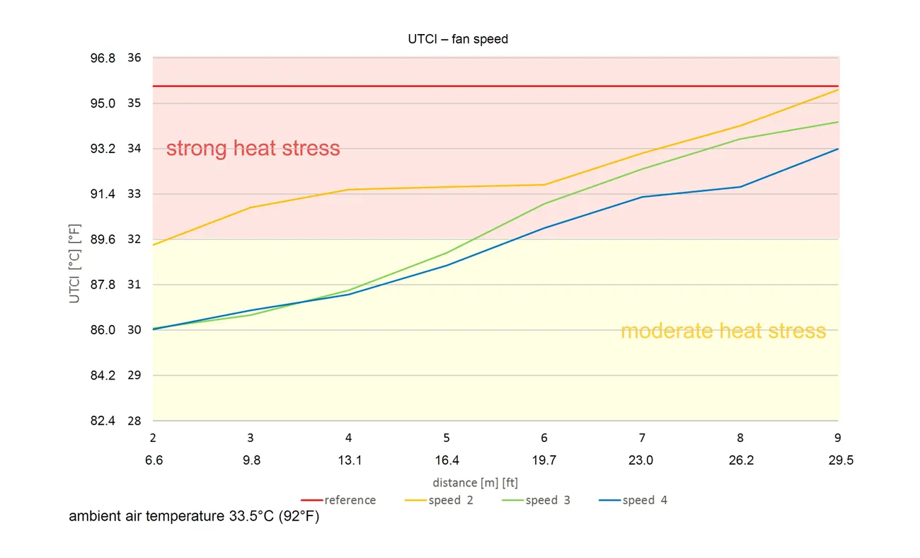 Zusätzlich zu den Reaktionen der Besucher wurde die Leistung des Trockennebelsystems anhand des bioklimatischen Komfortparameters Universal Thermal Climatic Index (UTCI) gemessen, der eine Verbesserung des Komforts bestätigt.