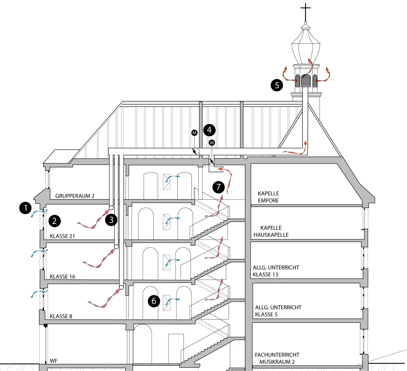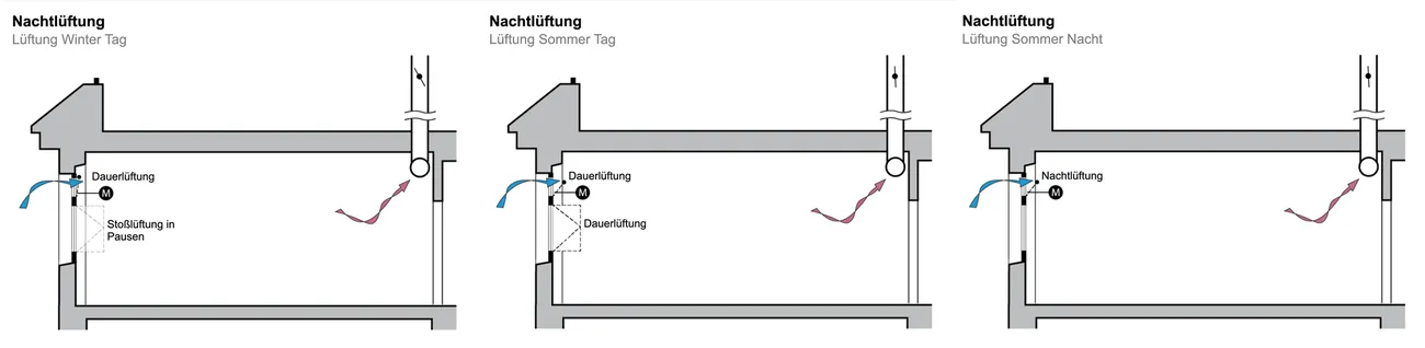 Die Klassenzimmer im Neu- und Altbau haben nun eine sogenannte Schachtlüftung über einzelne Abluftkanäle in jedem Raum. Diese werden im Dach zusammengefasst und zentral im Altbau abgeführt, was besonders wirkungsvoll ist, weil der Abluftschacht dort weit oben in dem ehemaligen Glockenturm endet. Das System ist so eine zeitgemäße Version einer „Berliner Lüftung“, denn hier kontrollieren motorisierte Fensteroberlichter den Eintritt der Zuluft. Diese werden sowohl zentral geregelt, aber sie sind auch individuell in jedem Klassenzimmer übersteuerbar. Dies ist besonders im Winter wichtig, um eventuelle Zugerscheinungen minimieren zu können. Im Sommer entwärmt die Nachtlüftung die thermische Masse der Klassenzimmer. Um den Effekt der Nachtlüftung richtig nutzen zu können, sind mindestens 60% der Deckenfläche offen, also nicht abgehängt.
