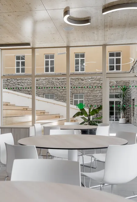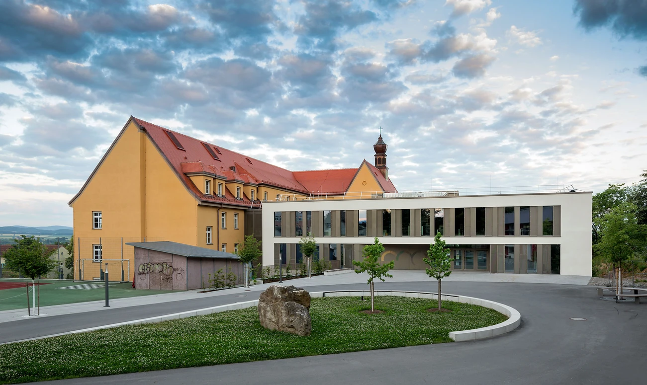 In der Kreisstadt in der Oberpfalz in Ostbayern gab es bislang zwei Realschulen, die nun fusioniert sind. Dafür ist das denkmalgeschützte ehemalige Studienheim „St. Josef“ aus dem Jahr 1924 ein Teil der neuen kirchlich geführten Schule auf dem Chamer Schulberg, die den Namen "Marienrealschule“ erhalten hat. Bestandsschonend erweitert ein Neubau Richtung Norden das Gebäude. Lehrende, Schülerinnen und Schüler der früheren Maristen- und Gerhardinger-Realschulen sind seit Herbst 2021 dorthin umgezogen.