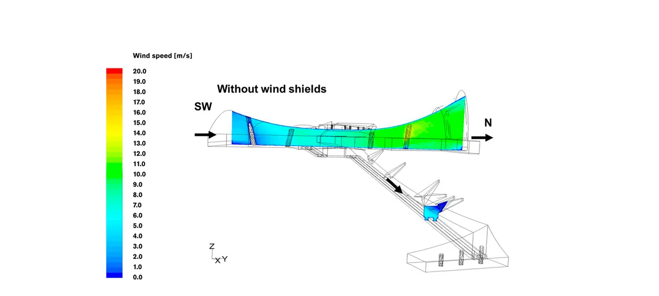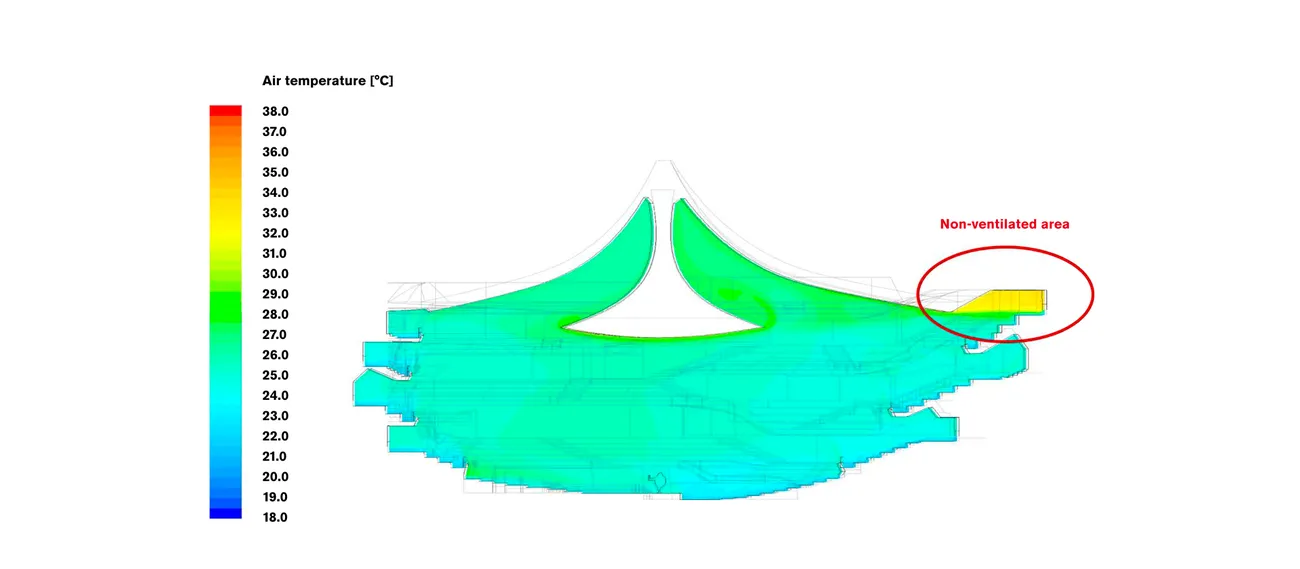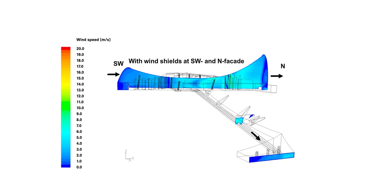 Die Glasfassade der Elbphilharmonie ist ein wichtiges gestalterisches Element der Außenansichtund konnte in dieser Form nur ohne bewegliche Verschattungselemente realisiert werden. Die Kombination aus Sonnenschutz- und Wärmeschutzverglasung mit zusätzlichem Spiegel- und Keramikdruck auf unterschiedlichen Scheibenpositionen gab den Architekten die notwendigen Freiheitsgrade für die Fassadengestaltung. In diesem Zusammenhang sind beispielsweise die komplizierten 3-dimensionalen, konkaven sowie konvexen Glasbiegungen zu nennen, aber auch die Gestaltung der Flächendichte des Druckdekors. Der Glasaufbau selbst stellt den sommerlichen und winterlichen Wärmeschutz sicher. Als Entscheidungsgrundlage für Glasaufbau und Bedruckungsgrad dienten thermische Simulationen.