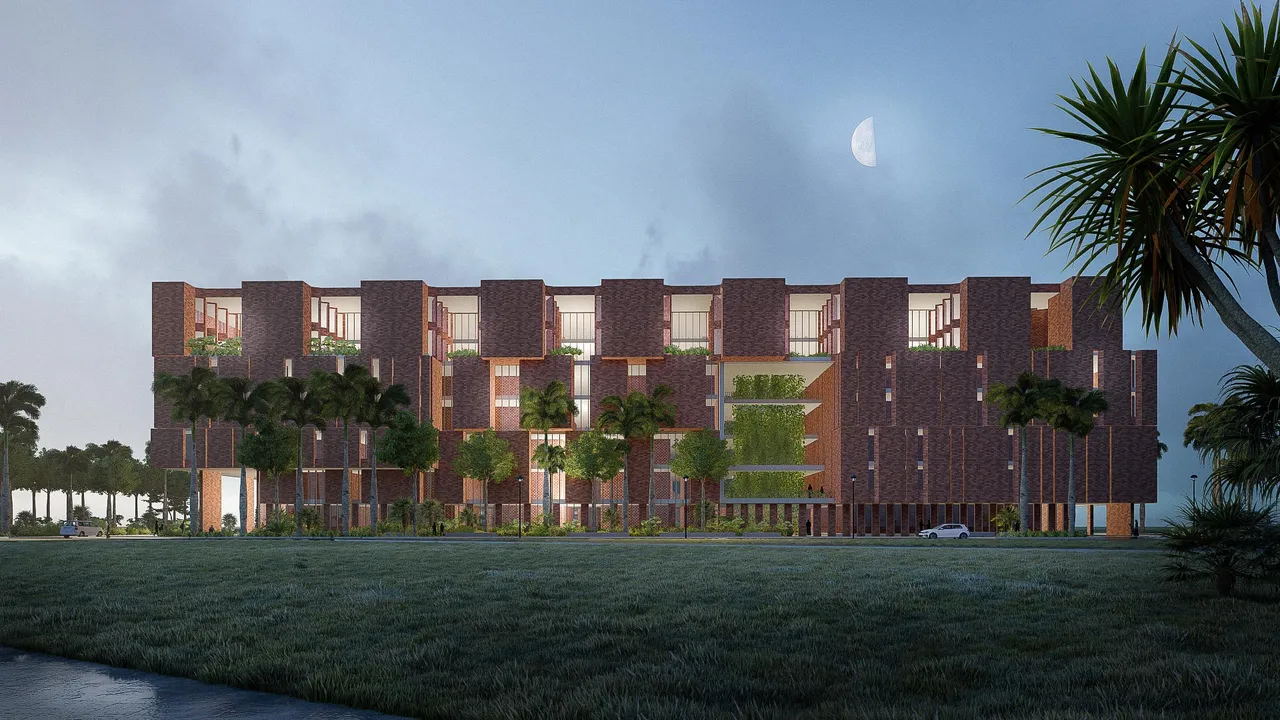 Die Arbeit von Transsolar, zusammen mit der MASS Design Group, begann mit dem Entwurf der Gebäudehülle: Alle Öffnungen sind sorgfältig dimensioniert, um Sichtverbindung nach außen zu gewährleisten und auch bei denen, die ausreichend Luft zur natürlichen Belüftung eintreten lassen. Zugleich müssen die solaren Gewinne möglichst klein sein, da sie im Klima von Dhaka eine besonders große Rolle spielen.
