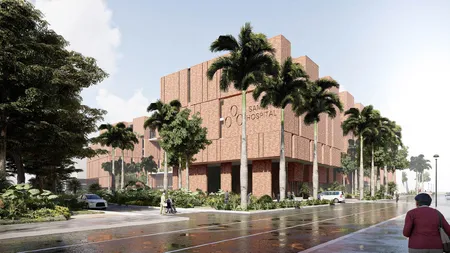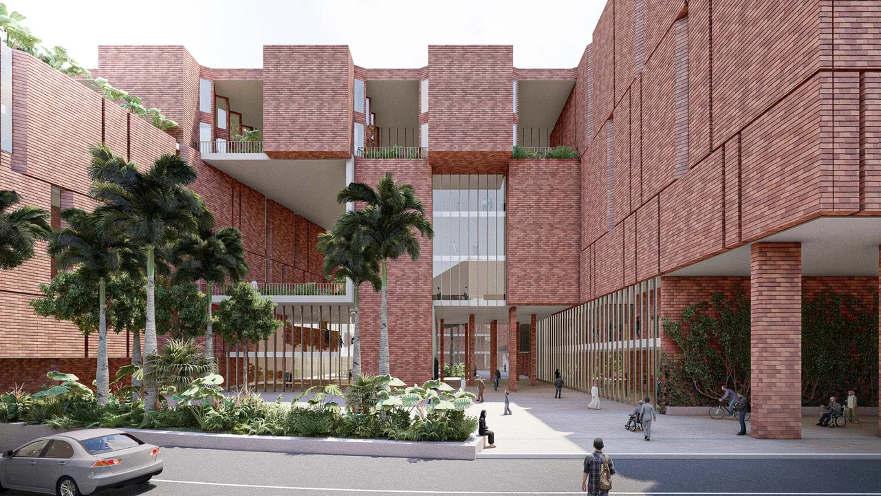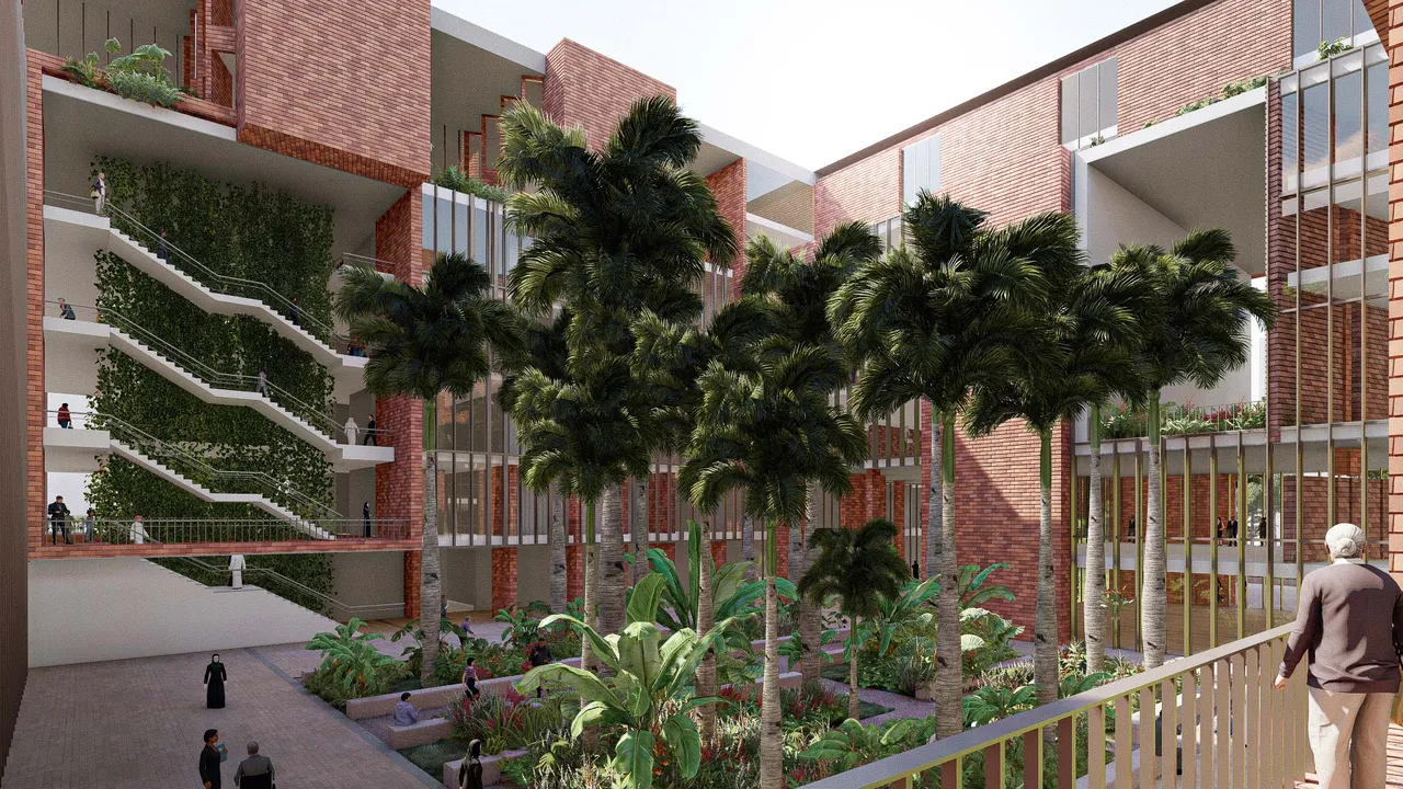 Für die Stationen dient ein System von Terrassen als witterungsgeschützte Räume im Freien, wo sich Besucher und Patienten treffen und aufhalten können. Zugleich wird hier auch die Luft vorbehandelt, die in Zeiten der natürlichen Belüftung in das Gebäude eintreten darf. Dafür sind Lufteinlässe an den Außenwänden der Patientenstationen angebracht, die an die geschützten Räume im Freien angrenzen, um von dort vorgekühlte Außenluft gefiltert zuzuführen, aber den Lärm des Straßenverkehrs abhalten. Großstadtluft mangelt es meist an Güte, auch in der Hauptstadt von Bangladesch. Daher entschied das Designteam zusätzlich, die Patientenstationen in den Etagen möglichst weit oben unterzubringen.