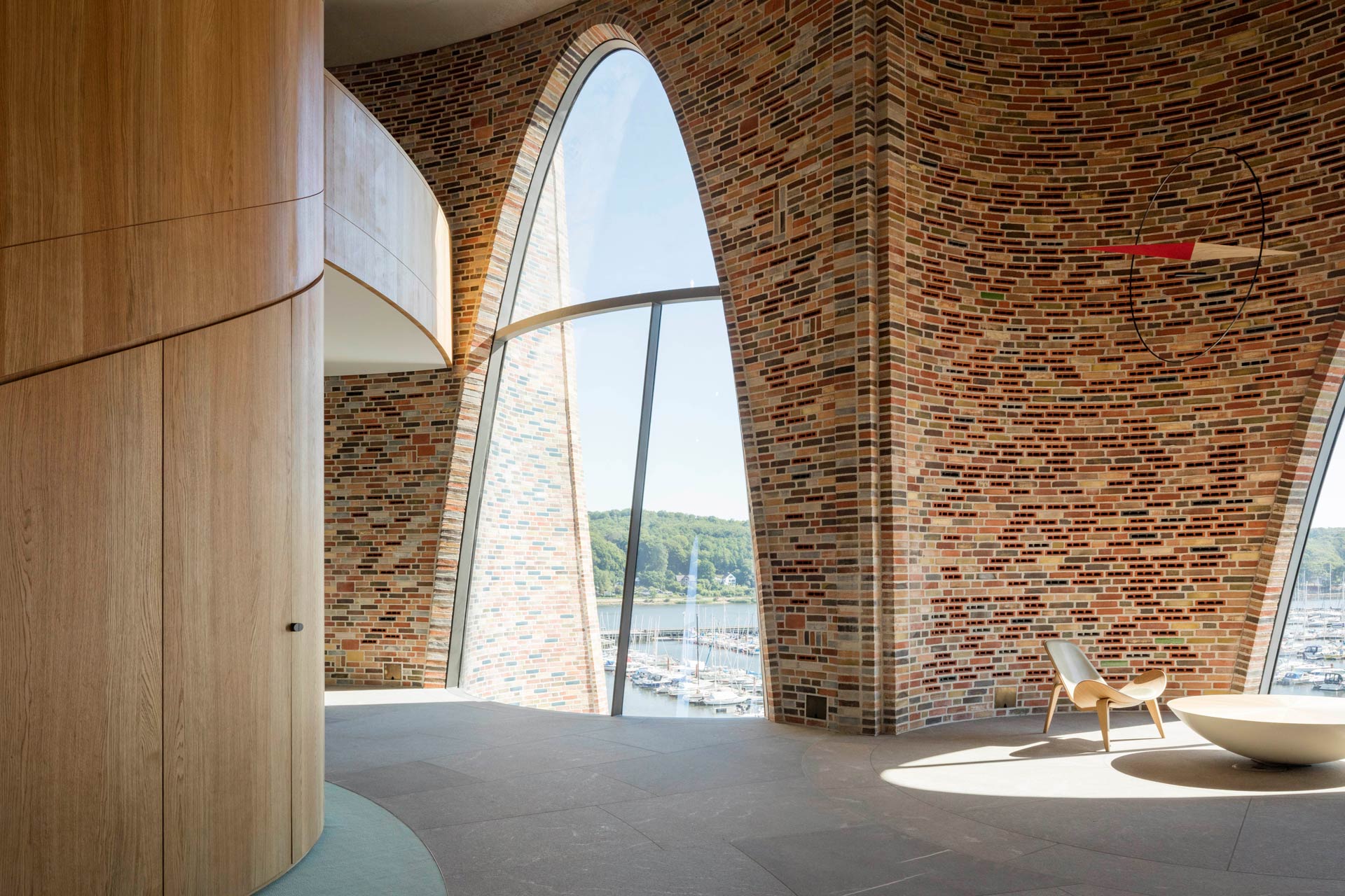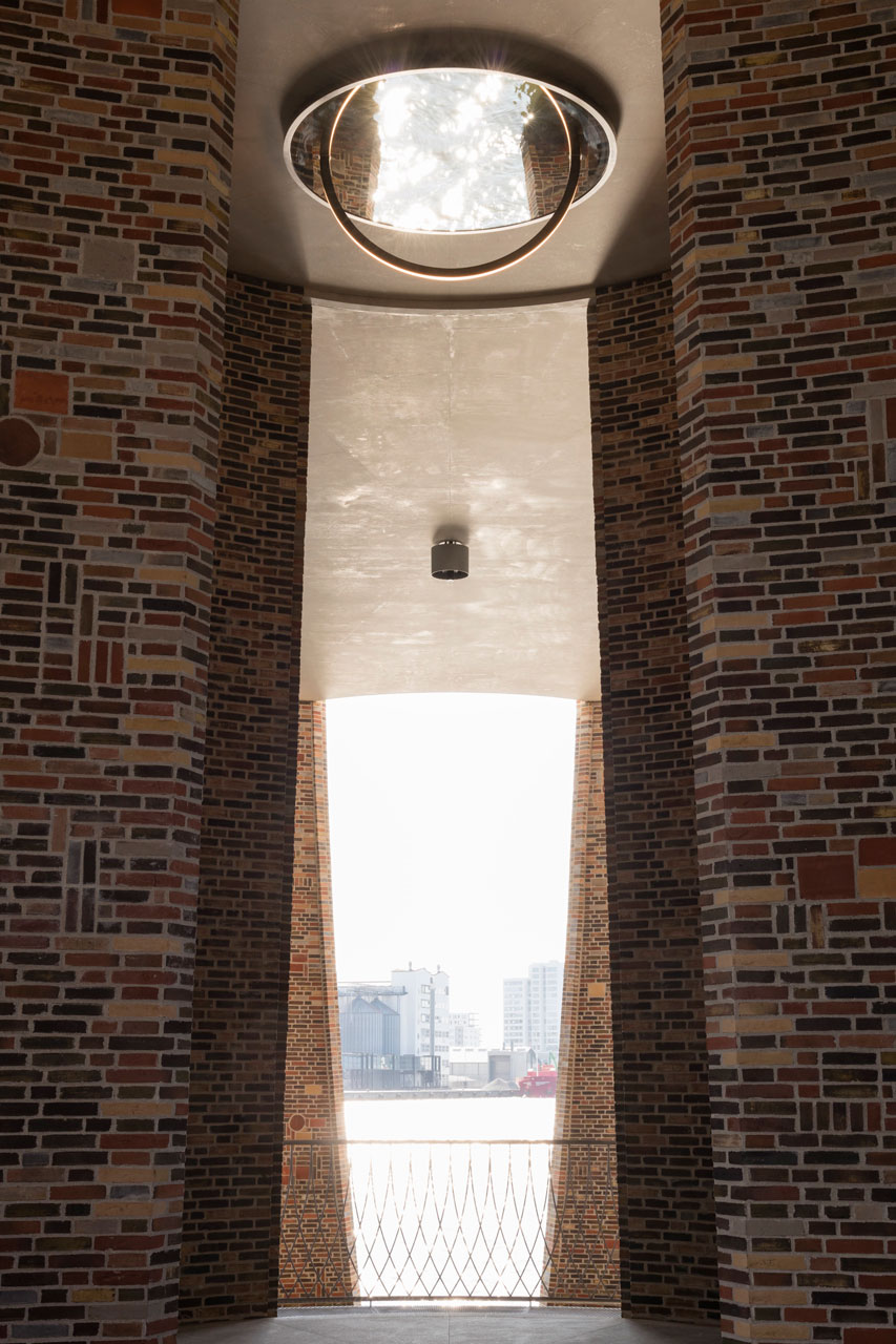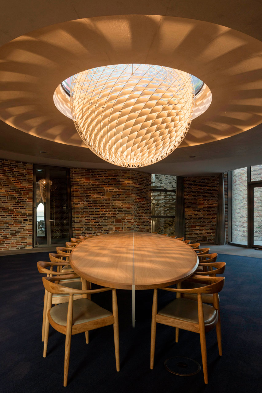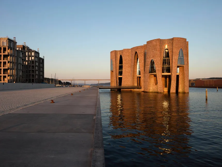 Das Hauptquartier der dänischen Investmentfirma Kirk Kapital A/S in der Hafenstadt Vejle (Jütland) ragt direkt aus dem Meer. Die Vision leben und arbeiten in der Umgebung des Hafens und des Wassers hat der Architekt durch großzügigen Sichtbezug zur Umgebung und Integration von öffentlichem Raum verwirklicht. Die Firma bezieht die oberen Stockwerke, der untere Bereich dient einem Café und einer Galerie. Zugang gewährt eine Brücke zwischen der Hafeninsel Havneøen und dem Gebäude. Das Dach des „Fjordenhus“ in 28 m Höhe ist begrünt und trägt PV-Module sowie eine Dachterrasse. Aus den vier Zylindern des Gebäudes sind in besonderer Geometrie Hohlräume ausgeschnitten, die an einem Ende kreisförmig und am anderen elliptisch sind, auch mit teilverglasten, bogenförmigen Öffnungen. Im Kern ist es eine Betonkonstruktion, innen und außen mit 970.000 Ziegel verkleidet, unglasierte und glasierte, in verschiedenen Farbtönen und Kombinationen. Zur Regulierung von Schall und Temperatur sind Hohllüftungssteine in die Innenfassaden integriert. Das Haus im Fjord enthält Büroflächen für alle drei Direktoren von Kirk Kapital und deren Mitarbeiter, dazu Räume für Tagungen, Konferenzen und ein Esszimmer. Besonderen Wert wurde auf die Beleuchtung des Gebäudes gelegt. Die LEDs im Inneren lassen das Gebäude nachts wie einen Leuchtturm erscheinen, zusätzlich gibt es außen Scheinwerfer unter Wasser. Transsolar hat von Beginn an hat die energetischen Ziele definiert und die Konsequenzen für CO2 Emissionen (inkl. der grauen Energie der Ziegel) bewertet und die Architektur in der atmosphärischen Gestaltung unterstützt und sichergestellt, dass die thermischen, visuellen und akustischen Komfortanforderungen gewährleistet sind. Die Performance der raumhohen Gläser wurde optimiert in Bezug auf Kaltluftabfall, das thermische Verhalten im Winter und die Eigenschaften im Sommer hinsichtlich der Eigenverschattung durch die elliptischen Ausschnitte in der Fassade. Das Design der natürlichen Lüftung in der Hafenumgebung (anspruchsvoll in Schallschutz und Luftqualität) wurden ebenso wie die Ausleuchtung mit Tageslicht in Iterationen entwickelt. Vorhänge mit unterschiedlichen visuellen und thermischen Eigenschaften gewähren den Nutzern Schutz vor Sonne sowie die gewünschte Privatsphäre, erhalten aber stets den Sichtbezug nach außen. In die akustische Deckenkonstruktion mit lichttechnischer Sonderfunktion wurde Strahlungswärme/-kälte integriert und deren Funktion nachgewiesen. Die Bauteilaktivierung legt interessante energetische Potentiale frei, da sie mit der Grundwasser-Wärmepumpenanlage im Fjord besonders effizient zusammenspielt.