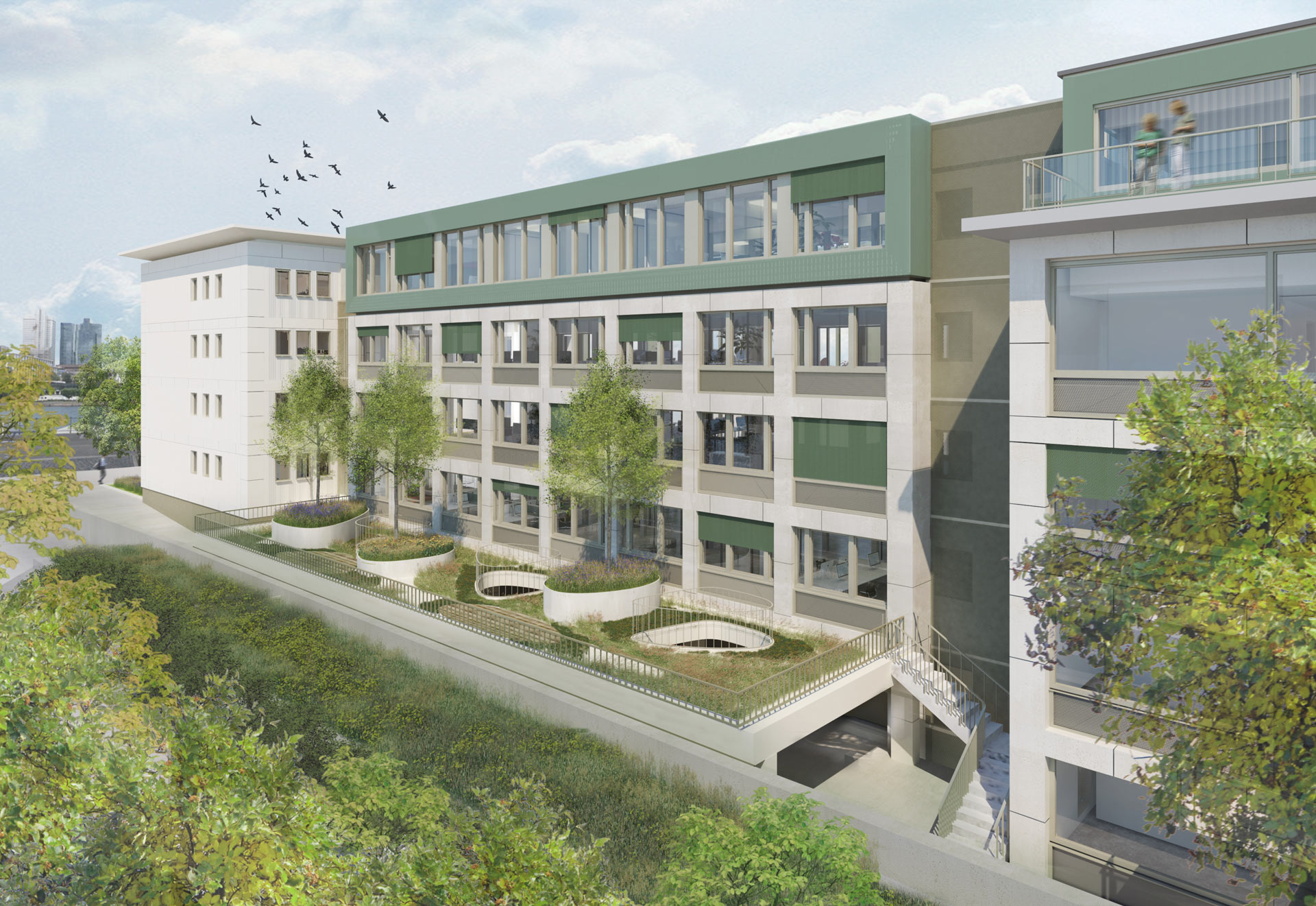 Die beiden hinteren Gebäudeteile Mittel- und Gartentrakt sollen eine Aufstockung erhalten. Die Aufstockung ist in Leichtbauweise, überwiegend Holzbau geplant und soll teilweise als Dachterrasse nutzbar sein. In Kombination mit extensiver Begrünung sind für die Dachflächen der beiden Aufstockungen sowie des Kopfbaus großflächige PV-Anlagen geplant.