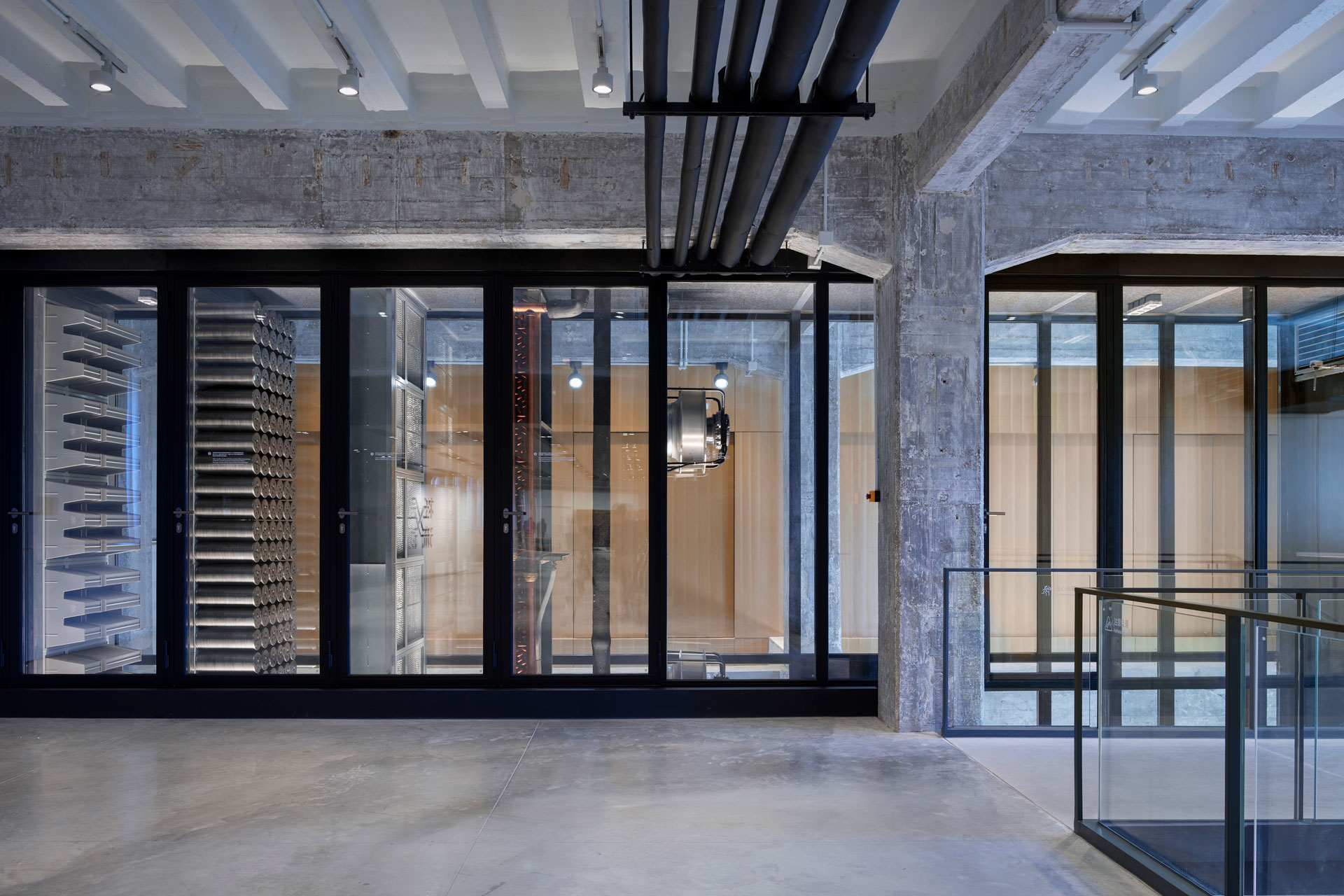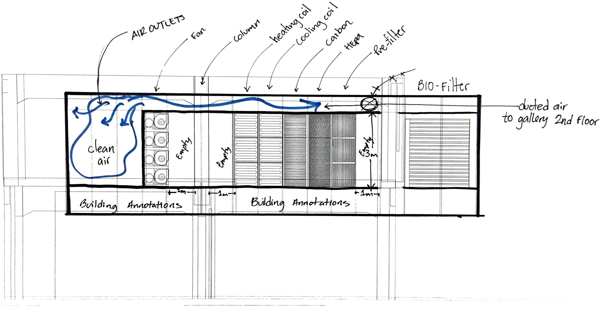 Zu diesem Zweck wurde die Anlage zur Luftaufbereitung zentral in der Eingangshalle verbaut und mit Glaswänden versehen. So sind alle notwendigen Abschnitte sichtbar, die es bedarf, um stark verschmutzte Luft zu filtern und zu konditionieren. In Strömungsrichtung von außen nach innen betrachtet, besteht das System aus den folgenden Stufen: In einem Vorgarten ragt zunächst ein verglaster Körper mit einem Biofilter, gefolgt von einem Vorfilter und einem HEPA-Filter, schließlich Aktivkohlefilter gegen die gasförmigen Schadstoffe; danach kommen die Heiz- und Kühlregister und eine Wand mit Lüftern. Ein durchschnittlicher Besucher des Gebäudes wird eine solche Abfolge nie zuvor gesehen haben. Mit den ‘Building Annotations’ hat die Anlage auch einen künstlerischen Ansatz; diese Anzeige an der Decke visualisiert den aktuellen Zustand der Luft im System an der jeweiligen Stelle darüber und macht die Wirkung eines jeden Filters deutlich.