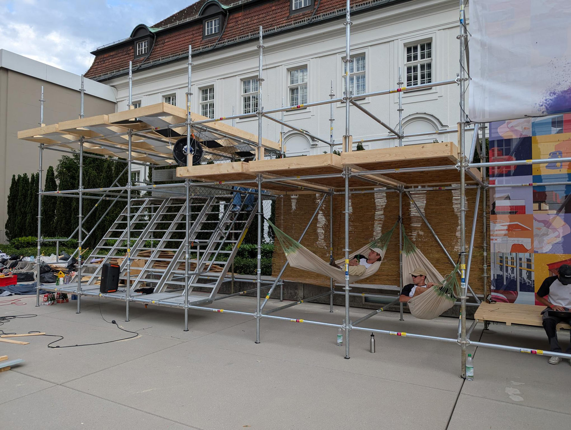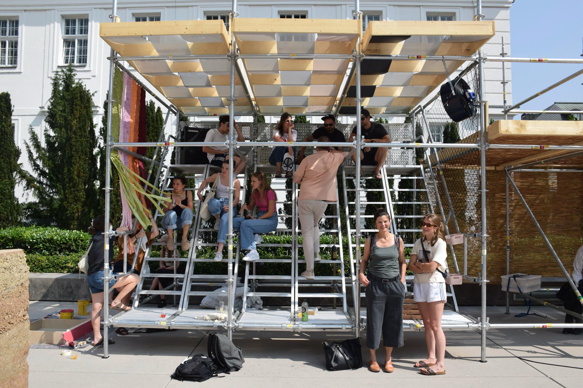 Wie heiß und ungemütlich es auf der Betonplatte werden kann, war beim Aufbau durchaus spürbar. Die schattigen Ecken waren willkommen zum Durchatmen und kurzen Abkühlen zwischendurch. Die Installation ist durchaus sehenswert, zumal eine kurze Vorbereitungszeit und lediglich ein Mini-Budget gegeben waren. So wurden Stoffbahnen aus Stoffmustern aus unserem Lager zusammengenäht und die Studierenden haben Bambuspflanzen über Kleinanzeigen gefunden, selbst ausgegraben und in Kübeln aufgestellt. Holz wurde gekauft, die Dry Mist Fans wurden von Transsolar als Leihgabe zur Verfügung gestellt.