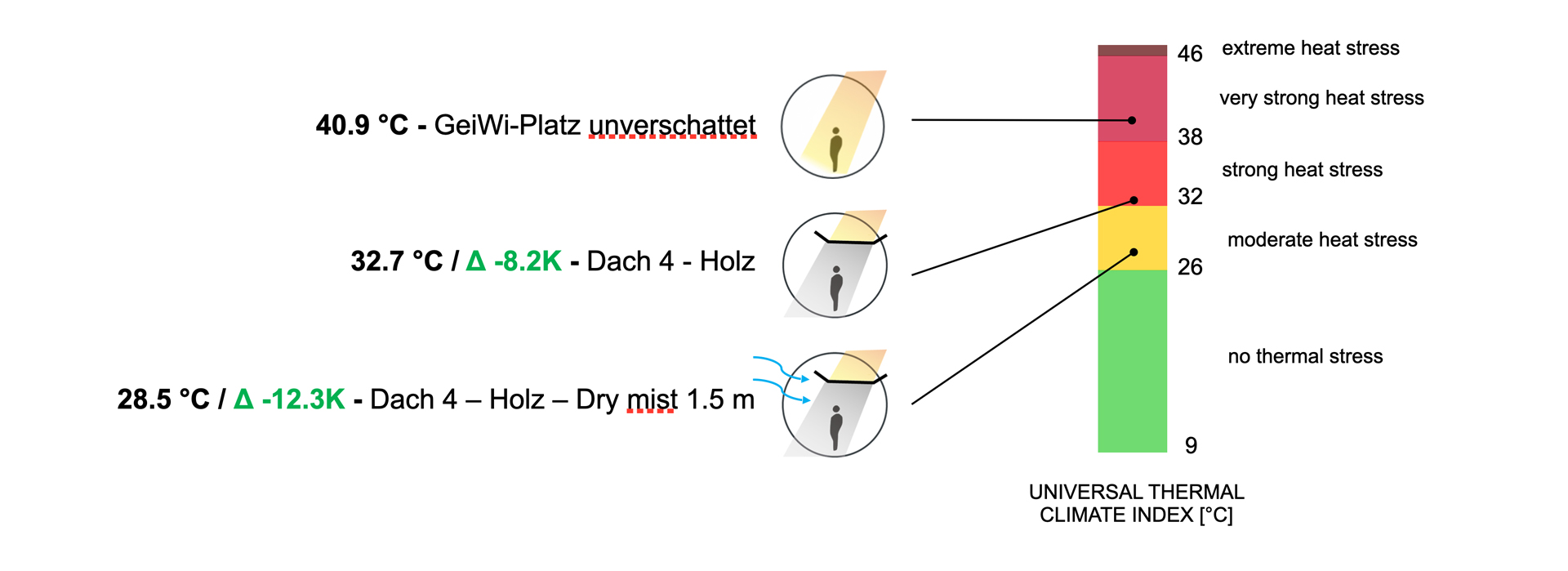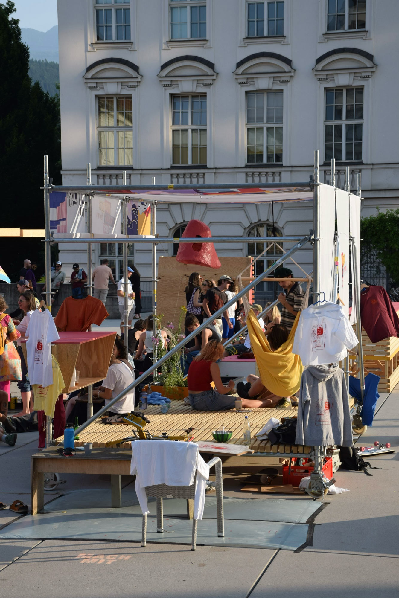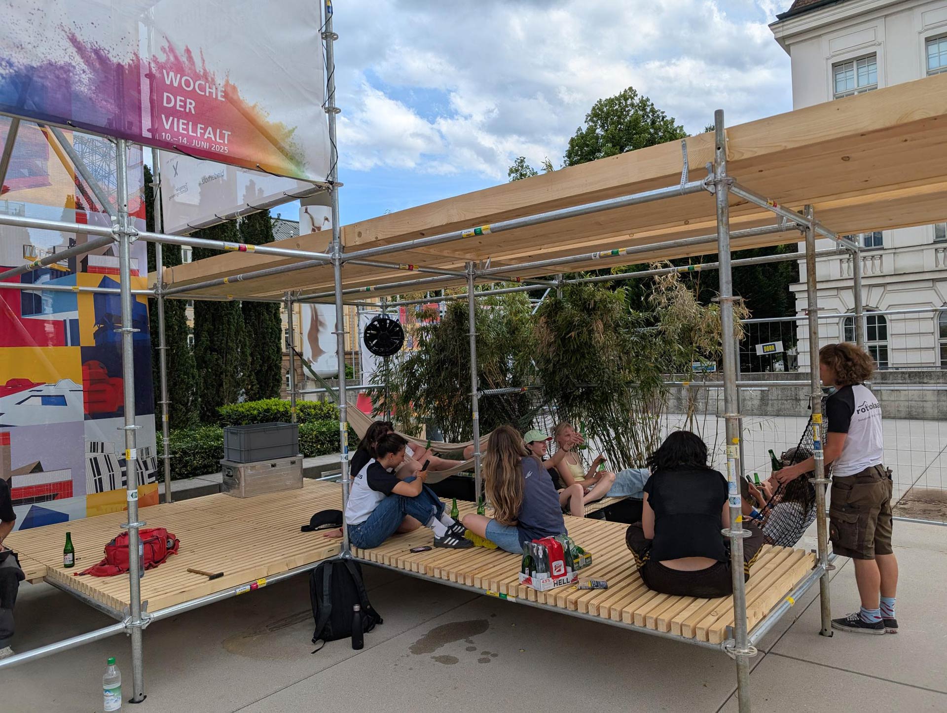 Das Ergebnis der Zusammenarbeit mit dem Studio 2 der Architekturfakultät, dass die Gesamtkonstellation der Stadtmöbel und Gerüste entwickelte und baute, machte den Platz nicht nur klimatisch angenehmer, sondern an heißen Tagen eigentlich erst nutzbar. Ermöglicht haben das die Verschattungs-Installationen aus Holz, Bast und Stoff ergänzt mit etwas Begrünung sowie zwei DryMist-Fans.