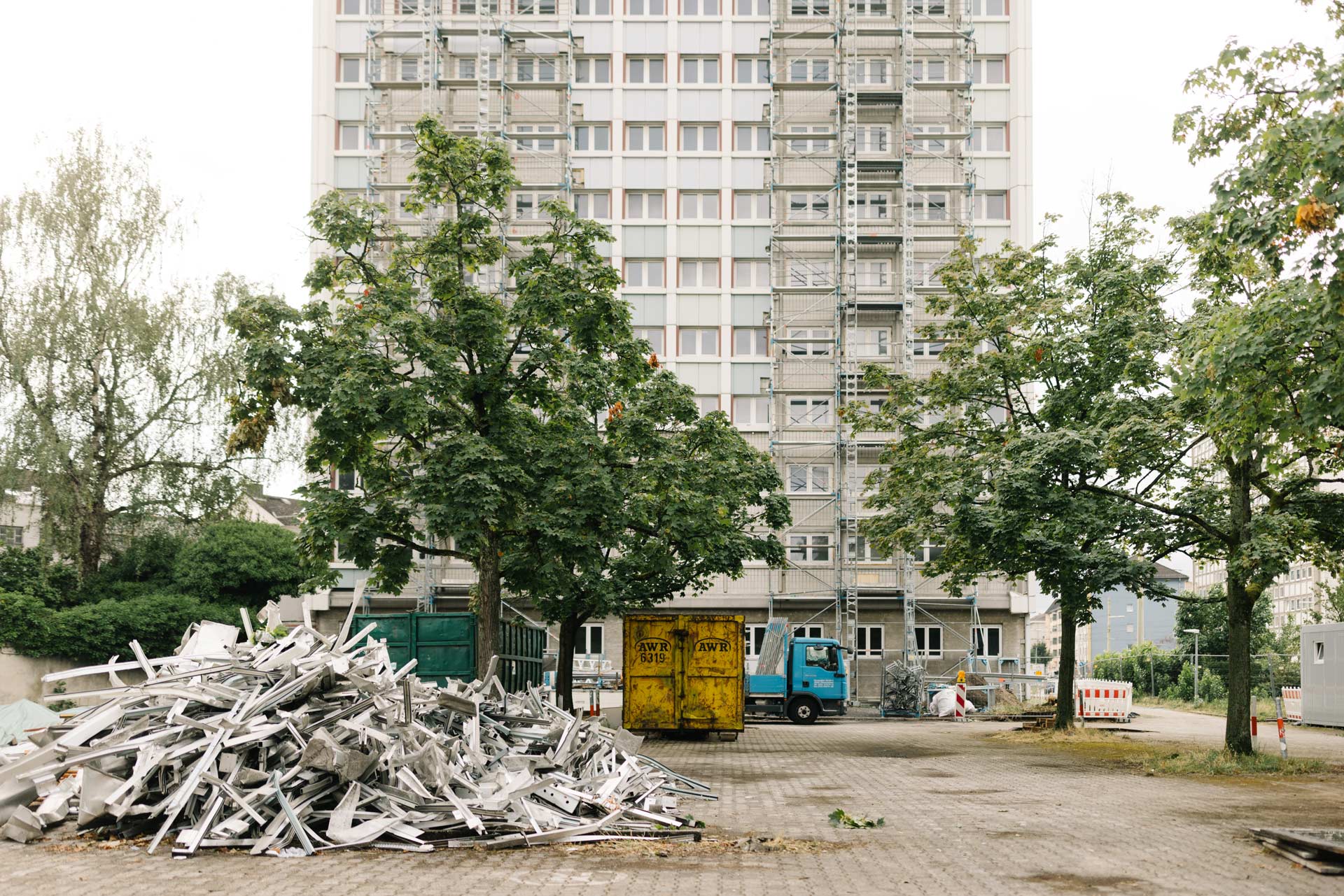 Ein Wohnhochhaus aus dem Jahr 1963 erhält eine umfangreiche Modernisierung. Zunächst müssen Schadstoffe wie Asbest entfernt, dann der Brandschutz und die Energieeffizienz des Gebäudes auf einen aktuellen Stand gebracht werden.