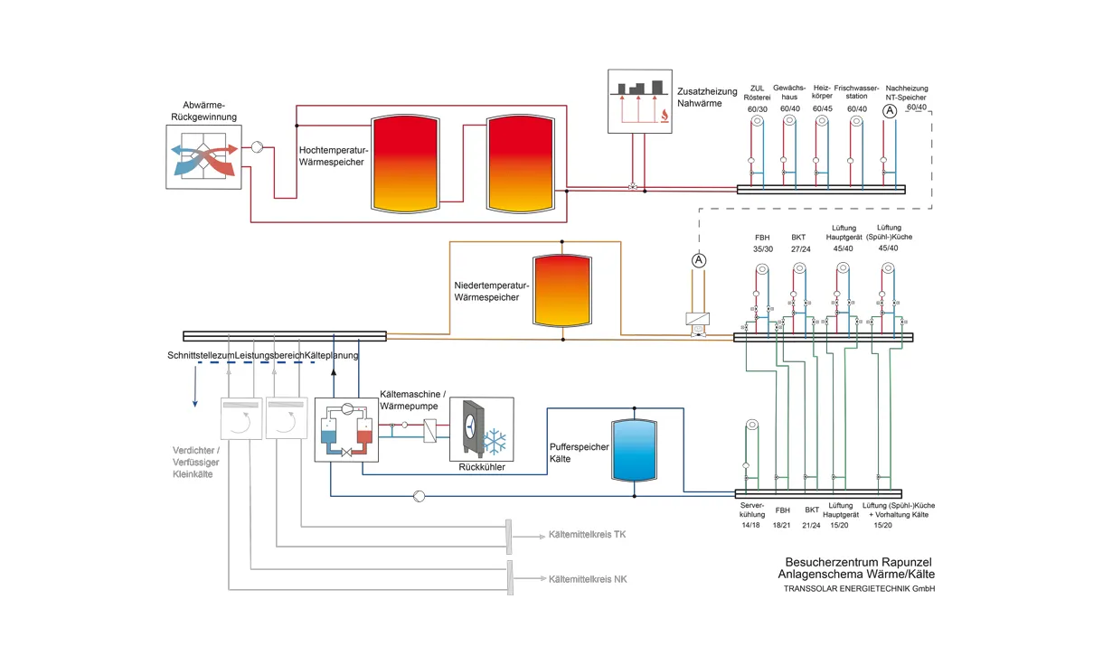 Mit welchem Anteil die Abwärme der Rösterei den Gesamtwärmebedarf des Gebäudes deckt, hängt vom Betrieb der Röstanlage ab. Während einiger Wintertage wird voraussichtlich zusätzliche Wärme aus dem Rapunzel-Holzkraftwerk benötigt; im Sommer fällt mehr Abwärme an, als im Gebäude genutzt werden kann. Der Neubau ist über eine Nahwärmeleitung mit dem Produktionsgebäude verbunden, die Abwärme aus dem Besucherzentrum kann so potenziell auch in der Produktion genutzt werden. Der Abgaswärmeübertrager der Rösterei gibt die Wärme an zwei 5.000 Liter Pufferspeicher ab, von denen alle Wärmeverbraucher, allen voran das Gewächshaus, die Warmwasserbereitung der Küche sowie die Nacherhitzung der Niedertemperaturheizkreise bedient werden. Auch die Abwärme aus der Kleinkälteerzeugung der Kühlhäuser, Kühlschränke und -theken, Tiefkühlschränke sowie der Serverkühlung wird genutzt. Als Abwärmequellen sind sie mit dem Niedertemperaturspeicher verbunden, der die Niedertemperaturheizkreise der Fußbodenheizung, Bauteilaktivierung und Lüftung versorgt.
