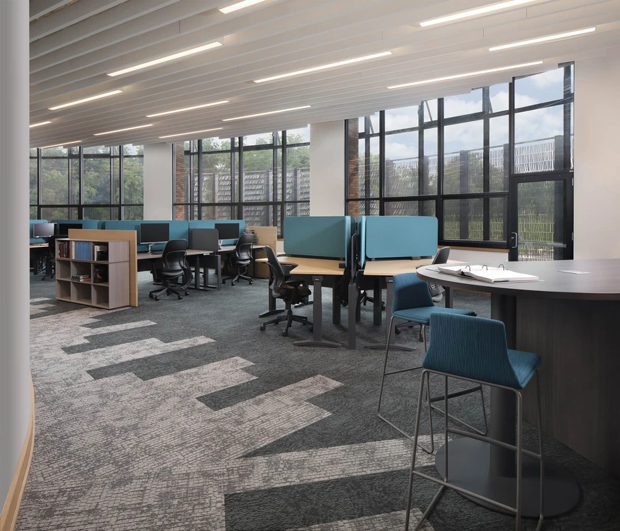 In den Bürobereichen und im Atrium erfolgt die Belüftung hybrid. D.h. bei moderaten Außenbedingungen kann natürlich gelüftet werden, ansonsten mechanisch. Dabei erfolgt die Luftzufuhr als sogenannte Quelllüftung, wobei die Frischluft durch Luftauslässe in Bodennähe in den Raum tritt, dann langsam nach oben wandert, wo sie durch Überströmöffnungen in Deckennähe abgeführt wird. Dieses verwirbelungsfreie Einbringen von Zuluft in den Raum verdrängt effizient und ohne Komforteinbußen die belastete Raumluft, ohne sich mit ihr zu vermischen.