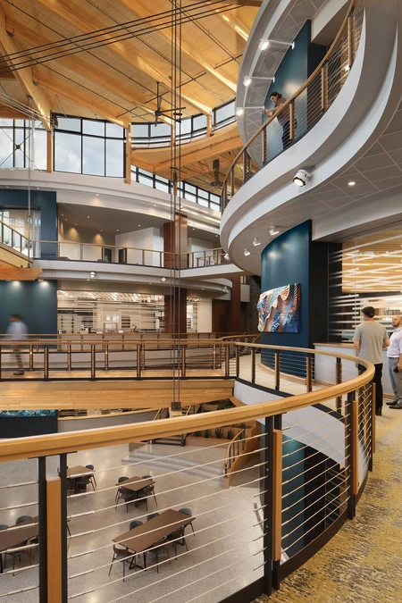 Die Arbeitsbereiche gruppieren sich um das Atrium, in dem große Deckenventilatoren für sanfte Luftbewegung sorgen und die Aufenthaltsqualität im Winter wie im Sommer optimieren.