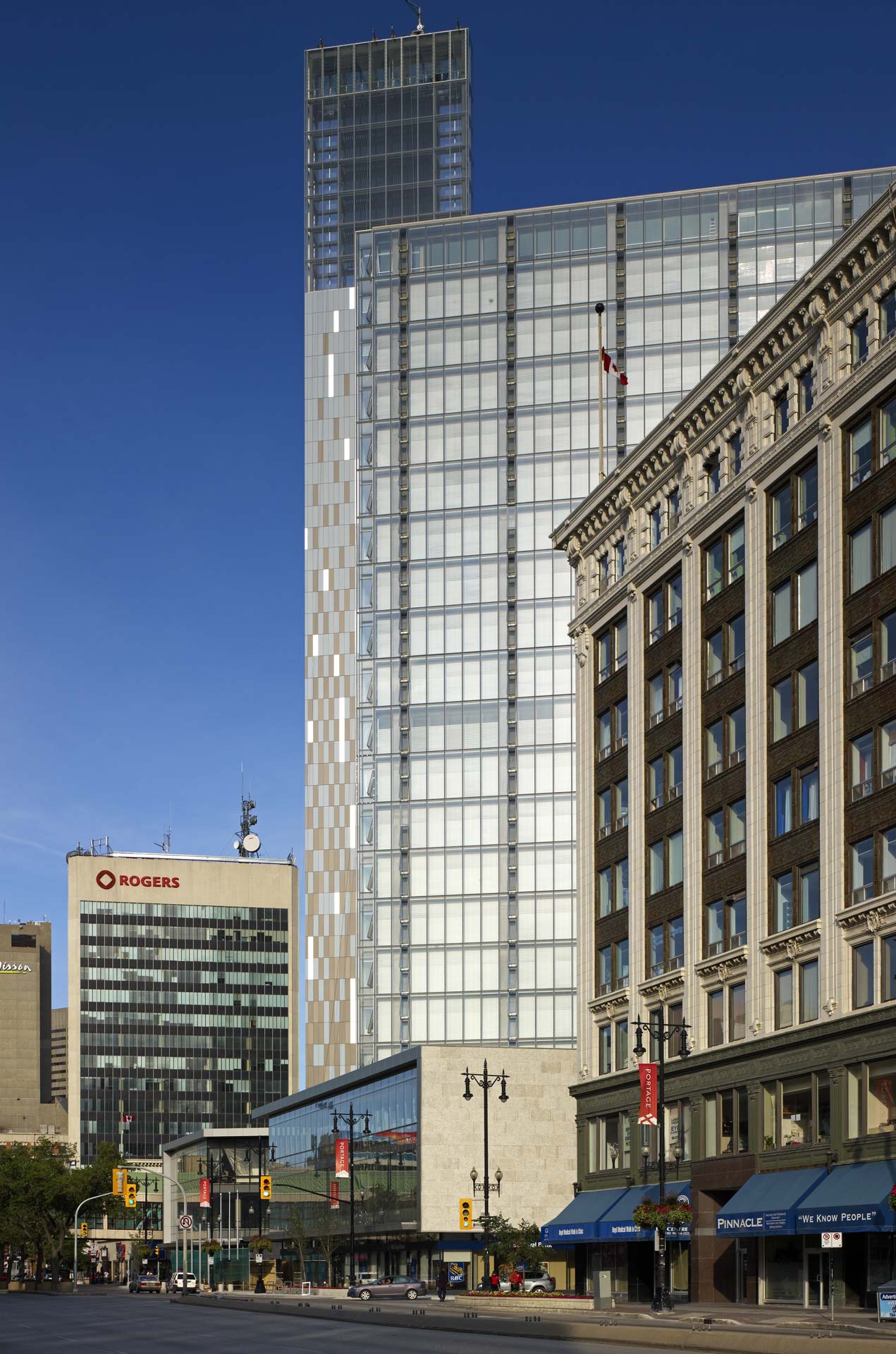 Im Stadtzentrum von Winnipeg ist eine innovative Arbeitsumgebung in einem Gebäudekomplex mit Tiefgarage, einem dreistöckigen Flachbau mit Büros, Restaurants und Ladenflächen und zwei schlanken 18-geschossigen Bürotürme entstanden. Winnipeg präsentiert sich mit 6.032 Heizgradtagen und den Auslegungstemperaturen von -35°C für den Winter und +35°C für den Sommer mit extremen Randbedingungen für das KlimaEngineering. Die Energieeffizienz des Gebäudes wurde durch folgende Maßnahmen maximiert: optimierte Gebäudeorientierung zur Nutzung passiver solarer Gewinne zur Raumkonditionierung; hohe Decken zur Verbesserung der Tageslichtnutzung; passiven solare Vorkonditionierung in Wintergärten und Doppelfassaden; hocheffiziente Wärmerückgewinnung reduzieren den Energiebedarf durch Vorerwärmung der Frischluft, Quelllüftung sichert stetige Frischluftzufuhr; öffenbare Fenster und Solarkamin ermöglichen natürliche Lüftung; die thermoaktivierte Bauteilkühlung und -heizung wird unterstützt durch ein Erdsondenfeld.