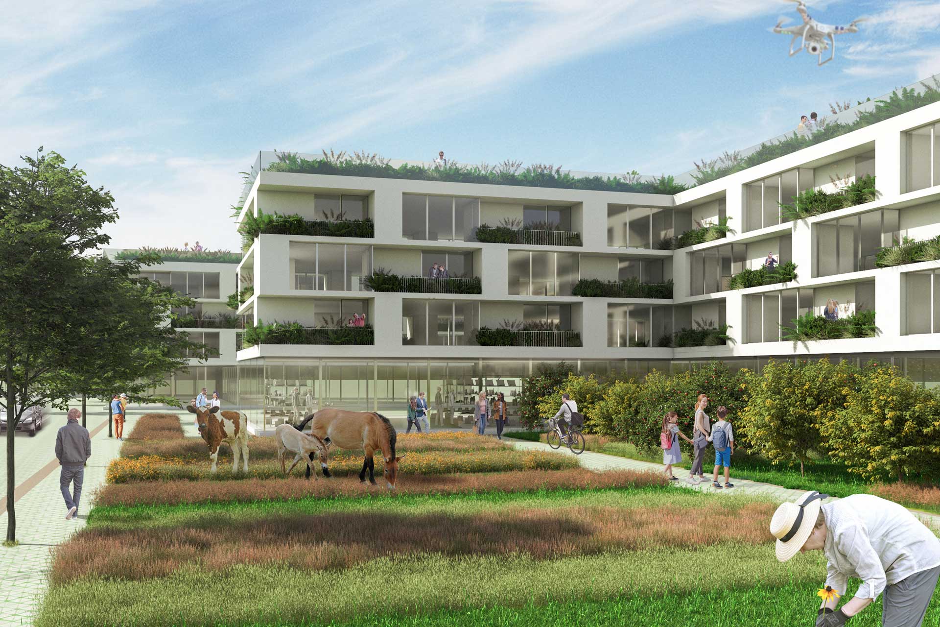Die Riverside bietet Wohnraum für 12.000 Menschen entlang eines grünen innovativen Rückgrats, das sanfter Mobilität gewidmet ist, wobei stets auf die Zugänglichkeit zu allen Bereichen des Viertels geachtet wird. Viel wird begrünt, auch vertikale Flächen und Dächer sowie in Bereichen für Coworking und Warenlieferung oder für Sport- und Freizeit und auch Fußgängerbrücken, um Raum für artenreiches Leben zu bieten. Eine Aufforstung im Distrikt ist geplant: 11.500 Bäume (1 pro Einwohner) bei einer Grünfläche von 13 qm pro Person. Der Bezirk wird sich selbst mit Energie, Wasser und Lebensmitteln, einschließlich aller öffentlichen Dienstleistungen versorgen. Im Wettbewerb wurden auch spezifische Bereiche für die Landwirtschaft mit 14.000 qm für Gartenbau definiert.