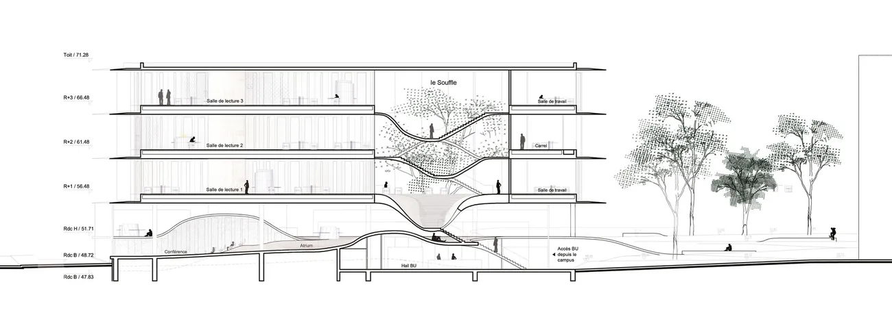 Mit dem Learning Center Atrium zeigt die Universität Montpellier ihre Vision einer Bibliothek in einer zunehmend digitalisierten Welt. Als Treffpunkt konzipiert, bietet das Atrium im Erdgeschoss viel Raum für Kontakt und Austausch unter den Studierenden; daran angeschlossen sind die Rezeption, die Cafeteria und die Ausstellungshallen. In drei Ebenen liegen Lese- und Arbeitsräume übereinander und bieten Möglichkeiten sowohl einzeln, als auch in kleinen Gruppen zu arbeiten. Hinzu kommen weitere Büroräume für Dienstleistungen und Buchbearbeitung.