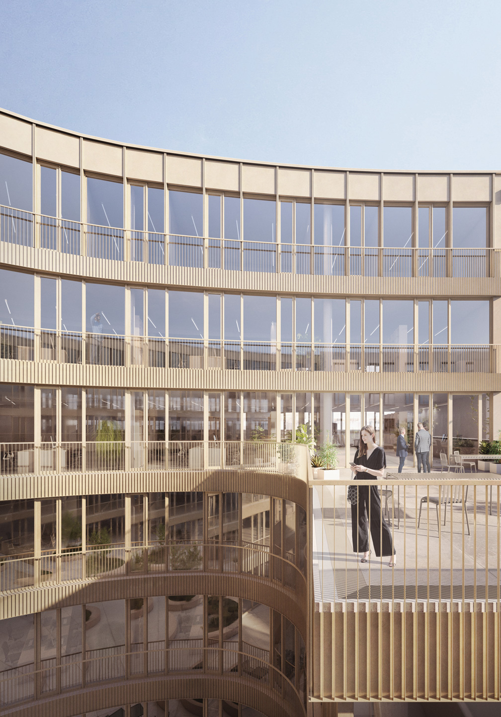 Zentraler Punkt dieses Entwurfs ist eine einzigartige Doppelfassade mit Blick auf die belebte Sonnenstraße und einen durchdacht gestalteten Innenhof. Das Klimakonzept des Gebäudes betont die natürliche Belüftung, den akustischen Komfort und die passiven solaren Gewinne im Winter und bietet eine nachhaltige und effiziente Arbeitsumgebung.