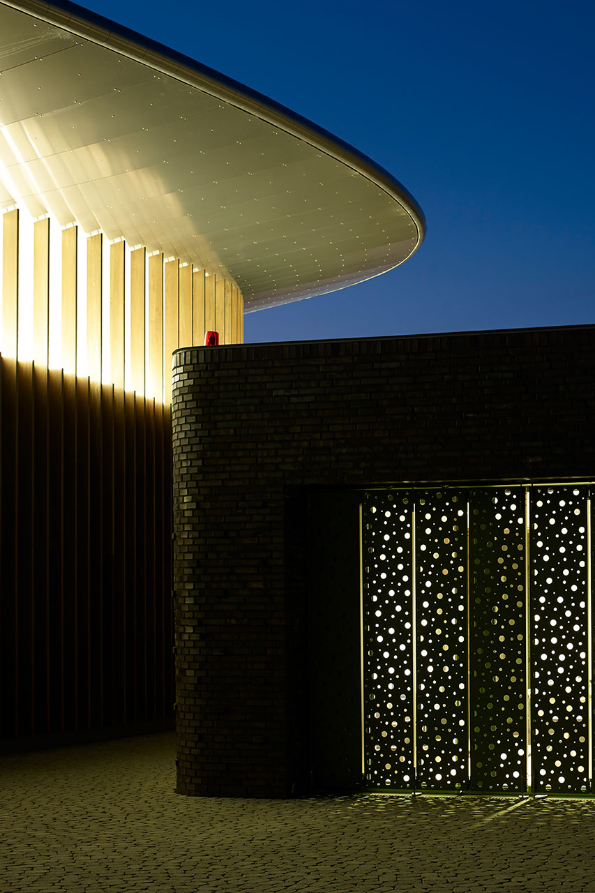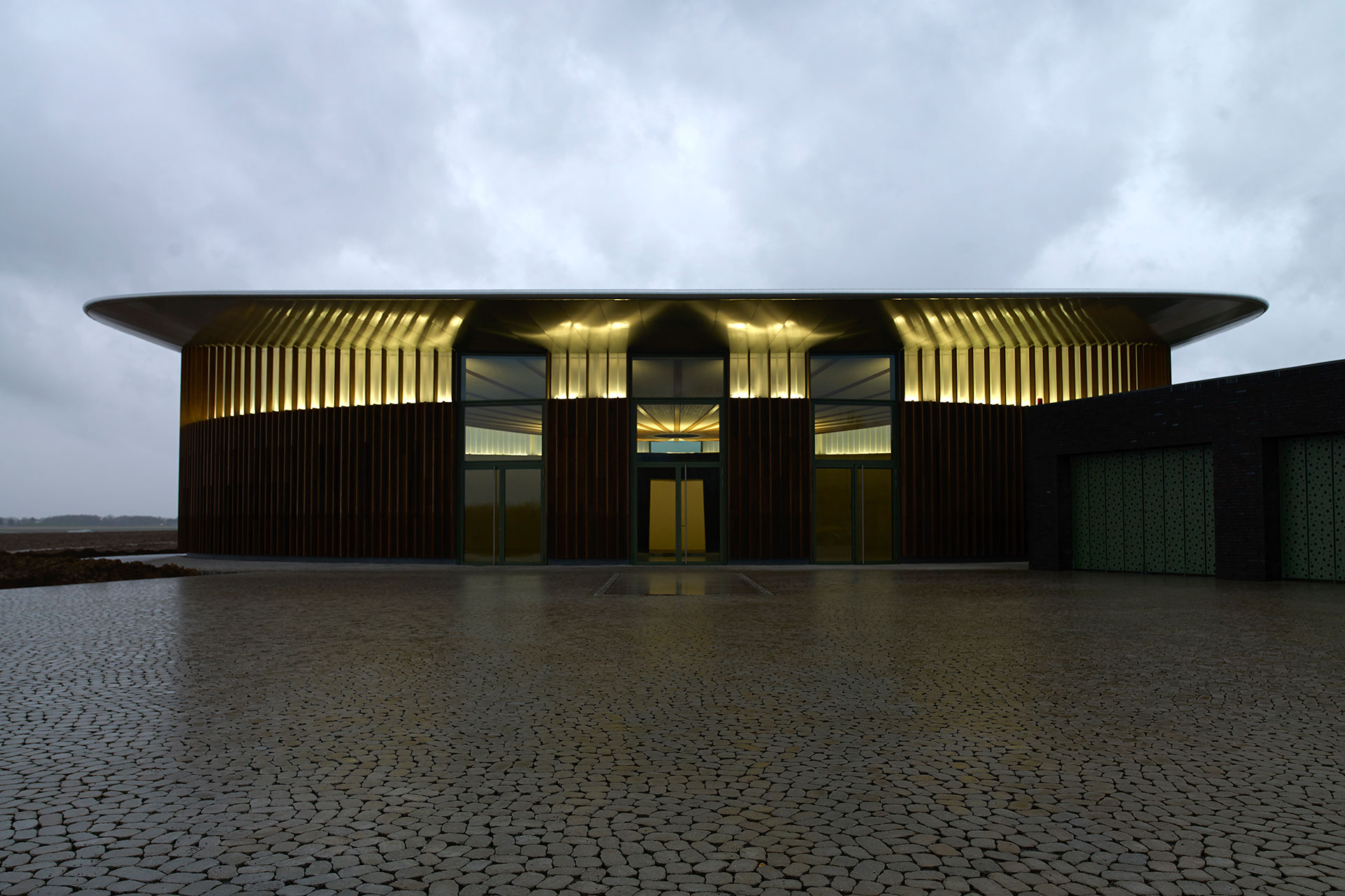 Für die ellipsenförmige Ausstellungshalle hat Transsolar ein besonders suffizientes Klima- und Lüftungskonzept entwickelt. Ziel war der völlige Verzicht auf einen EnEV-Nachweis im Rahmen der Baugenehmigung. Insofern liegt die Raumzieltemperatur in der Ausstellungsfläche für die Heizperiode bei gerade mal 12°C. Als Heizsystem ist in den massiven Boden lediglich eine wasserbasierte Flächenheizung integriert. Für die Be- und Entlüftung sind motorisch geregelte Klappen in der Fassade und im Dach vorgesehen. Darüber hinaus gibt es dezentrale mobile Ultraschall-Befeuchtungsstationen, die im Winter auf eine Luftfeuchte von 50 – 55 % r.F. befeuchten, sollten im Fall einer Veranstaltung temporär Raumtemperaturen von 20°C gewünscht sein. Auf eine Kühlung, Entfeuchtung oder mechanische Lüftung wurde gänzlich verzichtet. Trotzdem soll die Ausstellungshalle idealerweise in einem konstanten Feuchterahmen von 50 – 60 % r.F. und in einem Temperaturband von 12 – 28°C gehalten werden. Erreicht wird dies durch ausreichend thermische Masse, sommerliche Nachtauskühlung und eine bedarfsgerecht geregelte, natürliche Lüftung. Raumtemperatur, Luftfeuchte und CO2-Gehalt der Luft werden sensorisch erfasst und durch die Gebäudeautomation in Regelalgorithmen für Lüftungsklappen, Heizsystem und Luftbefeuchter umgesetzt. Bedingt durch den weitestgehend natürlichen Klimatisierungsansatz sind temporäre Unter- oder Überschreitungen der Raumklimakorridore jedoch zu tolerieren.