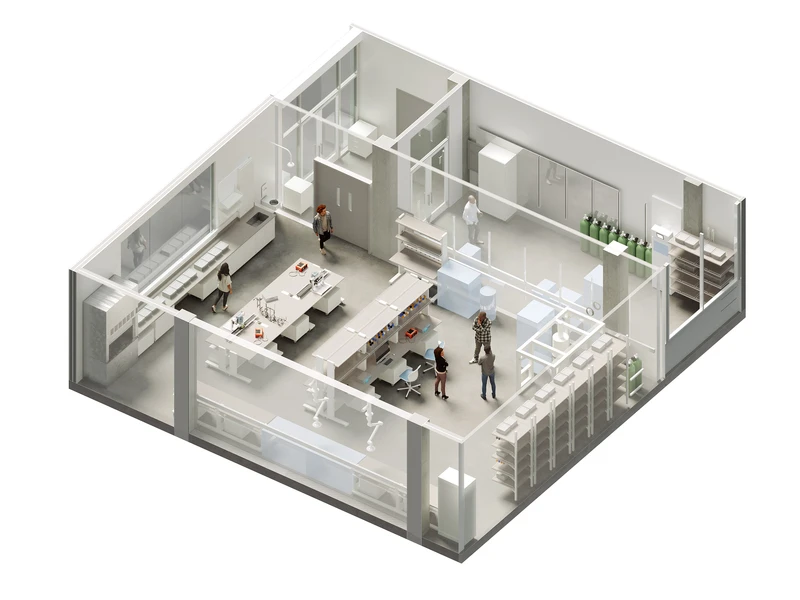 Entlang des zentralen Weges blickt man immer über, in, unter oder auf Forschungszentren und Nachbarschaften, wo Teams von Experimentatoren und Theoretikern aller Ebenen - leitende Forscher, Wissenschaftler, Gruppen von Doktoranden und Postdocs - nebeneinander arbeiten. Obwohl ein großer Teil des Gebäudes unterhalb der Erdoberfläche liegt, bringt das Design Tageslicht tief in die Struktur, wobei Licht- und bepflanzte Höfe strategische Orientierungspunkte und Sichtverbindungen nach draußen bieten.