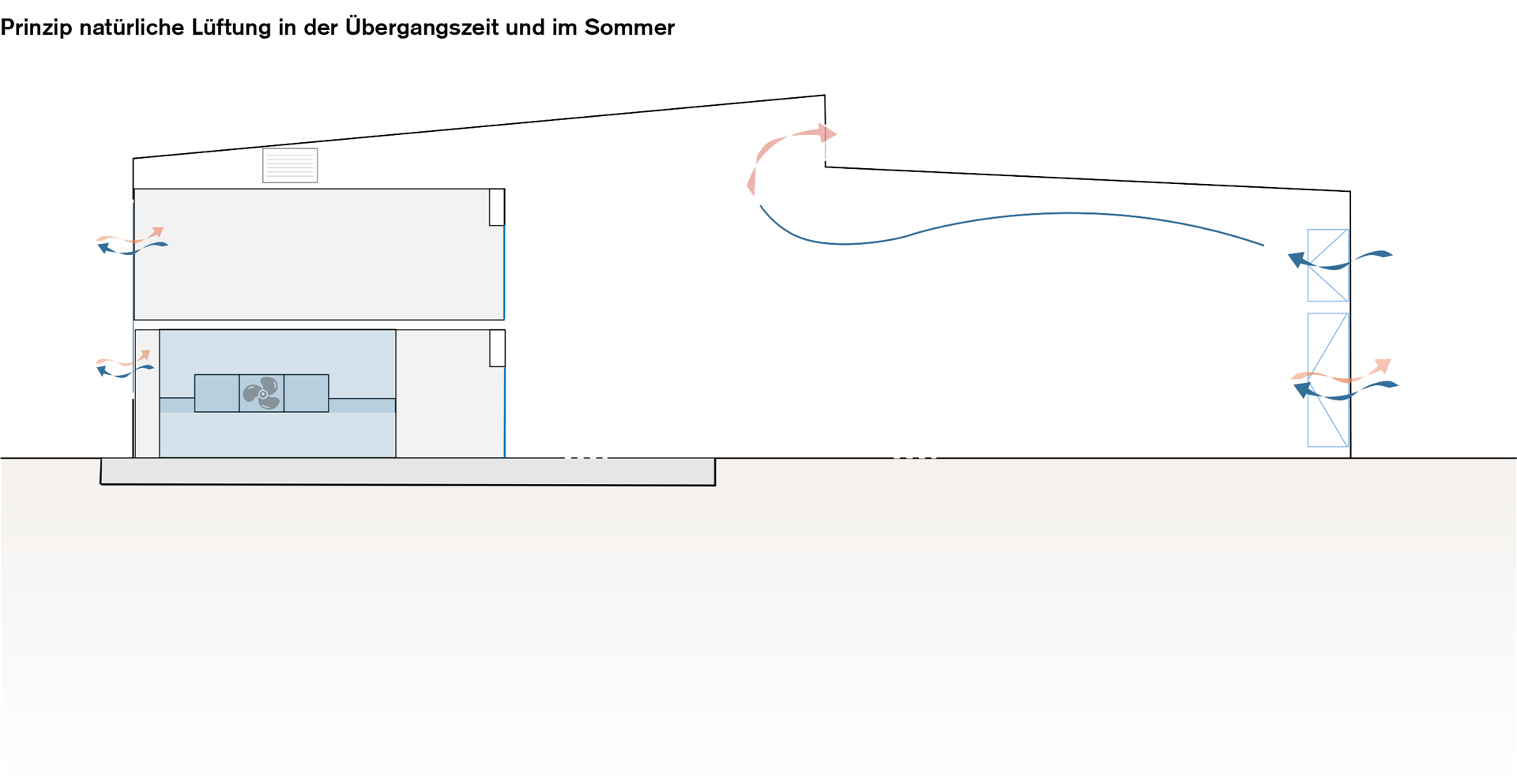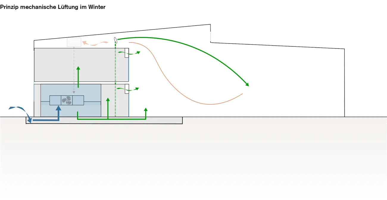 Zuluft kommt primär durch die alten Wartungsgänge und wird als Quellluft in die Schuppenbereiche verteilt. Bedarfsbelüftung erfolgt manuell über die Fenster. Dezentrale Lüftungsgeräte mit effizienter Wärmerückgewinnung sind pro Schuppenbereich nahe der Nasszellen vorgesehen. Das offene Raumvolumen und die Einbindung in die Luftverteilung minimieren das Lüftungskanalnetz.
