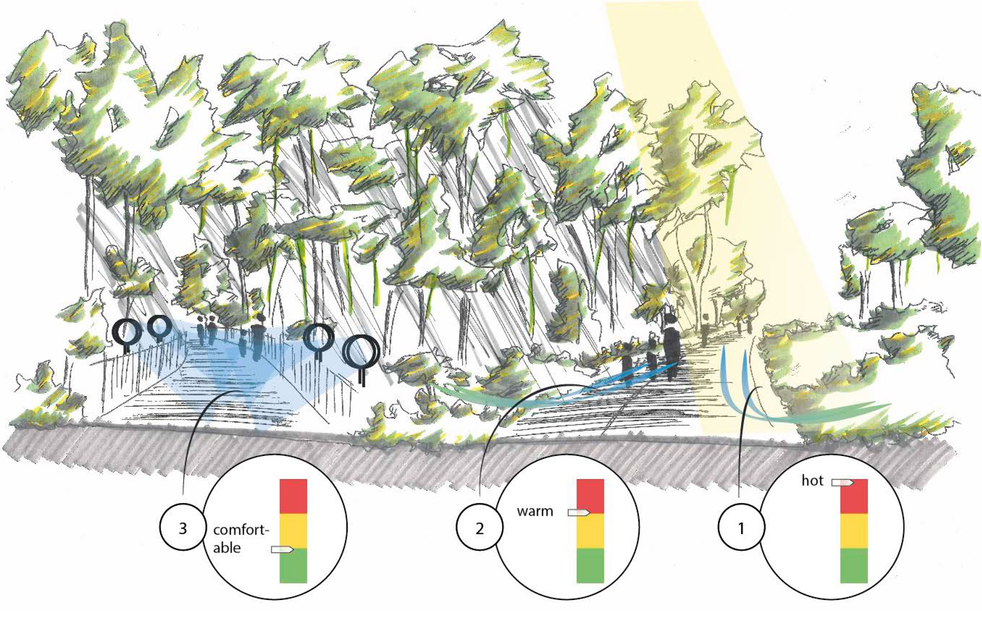 Transsolar hat sich daher mit fortschrittlichen Modellen aus der Human-Biometeorologie befasst, also der Wissenschaft, die Wechselwirkungen zwischen atmosphärischen Prozessen und Lebewesen, hier den Menschen, erforscht. Technisch formuliert lautet das Ergebnis: Trotz Erhöhung der Luftfeuchte bietet eine vollständig entwickelte adiabatische Kühlung in Kombination mit erhöhten Luftgeschwindigkeiten die Möglichkeit für eine große Verbesserung des Komforts im Freien.