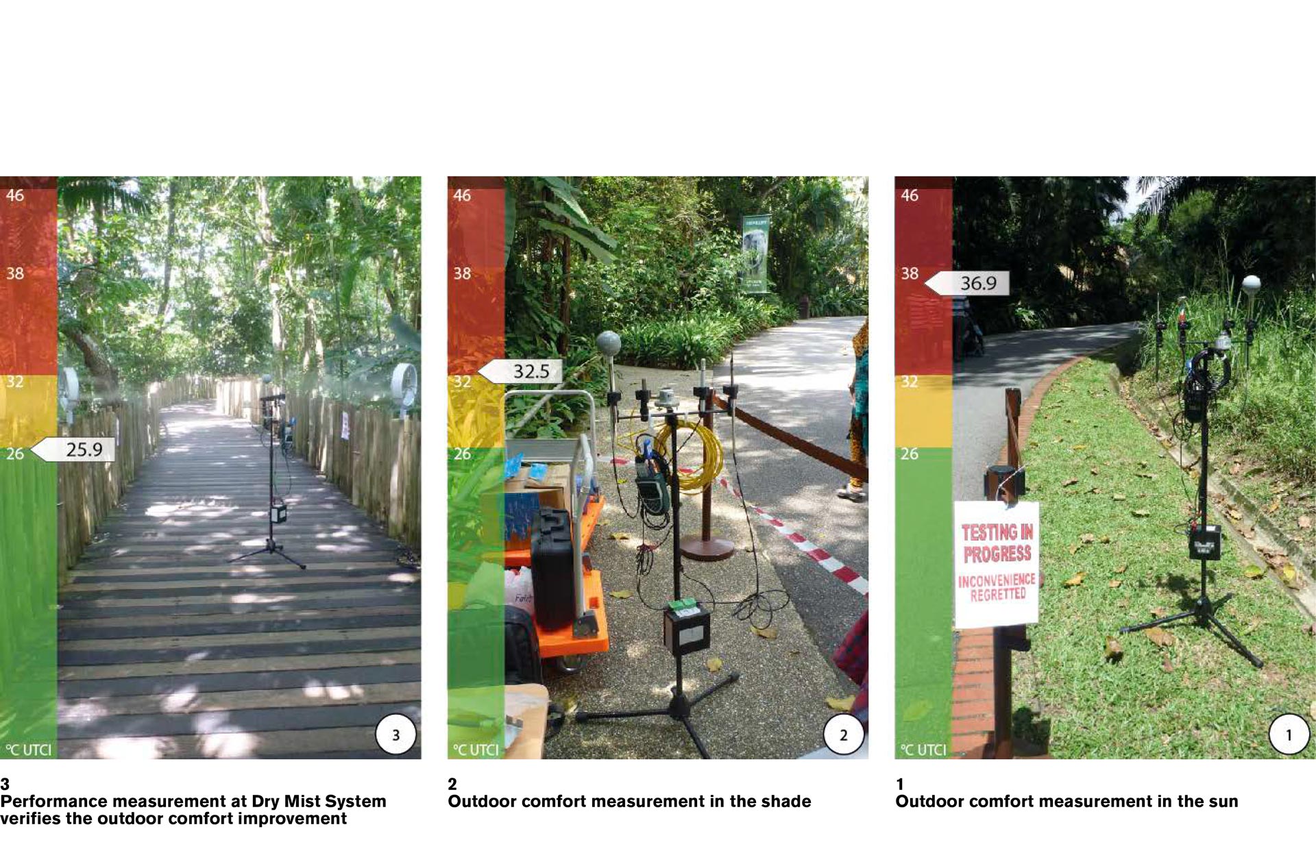 Beim Test im August 2014 im Zoo von Singapur mit Komfortmessgeräten erzeugte das Dry-Mist-System im sehr feuchten tropischen Zoo eine Reduzierung der gefühlten Temperatur von mehr als 6 ° C. Das Verfahren ist sehr energieeffizient. Die Leistungszahl (das Verhältnis von adiabater Kühlung zu Strombedarf) beträgt etwa 20, das ist viermal höher als bei herkömmlichen Klimaanlagen. Ein Ventilator behandelt einen Bereich zwischen 9 und 15 m² und verbraucht dabei maximal 5,4 Liter Wasser pro Stunde. Die Reaktion der Besucher zeigte, dass die kühle Brise des Dry Mist Systems mehr als willkommen war. Singapur hat erstmalig gezeigt, diese Low-Tech- und Niedrigenergielösung das Potenzial hat, öffentlichen Raum gezielt zu verbessern, von Wartebereichen im Freien über Bahnhöfe bis hin zu Plätzen und Parks.
