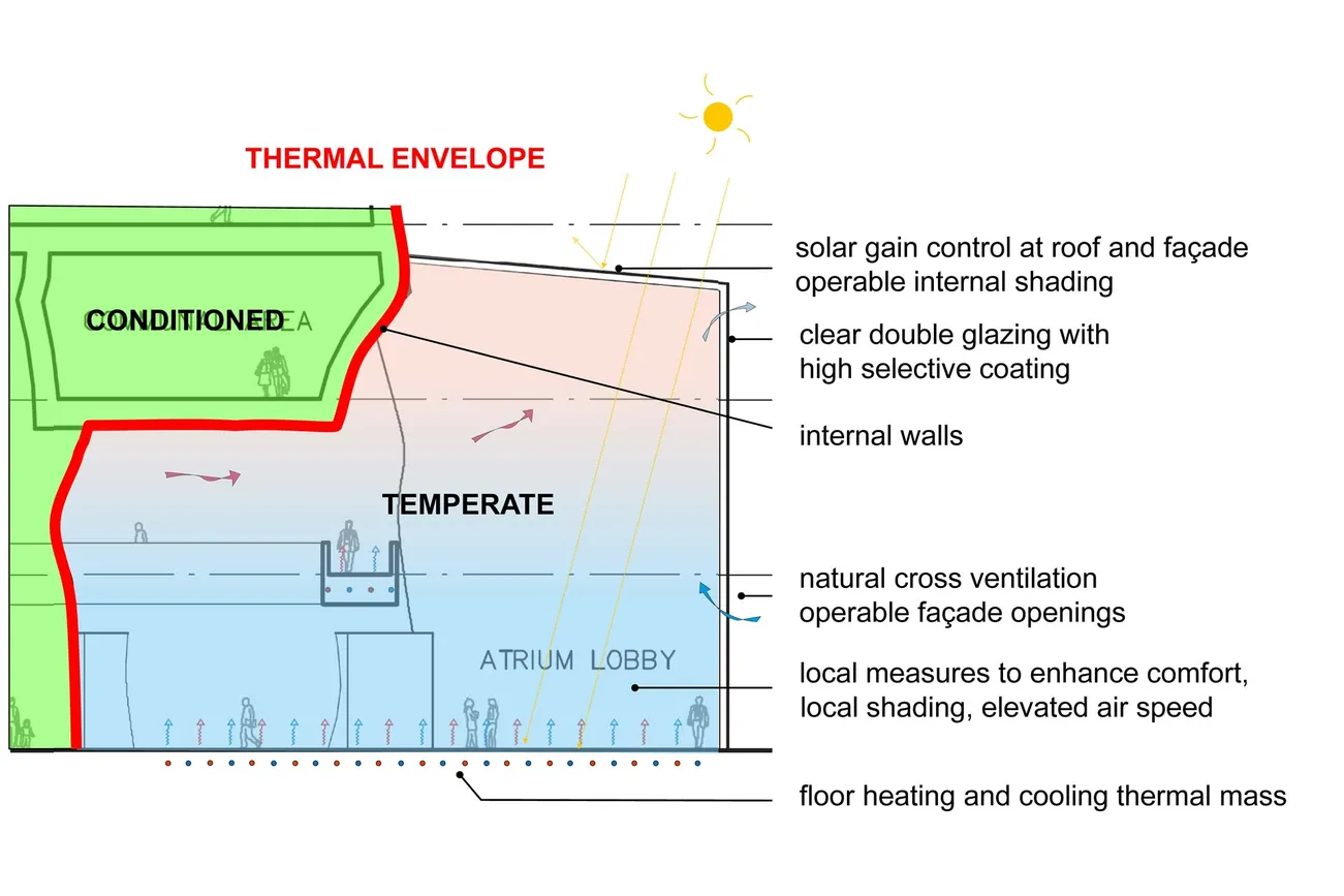 Transsolar hat das Klima-, Komfort- und Energiekonzept für den Turm und alle Gebäude des Parc des Ateliers entwickelt. Die Energieversorgung für dieses Gebäude, wie auch für die anderen Gebäude auf dem Gelände, erfolgt über eine zentrale Anlage mit Kraft-Wärme-Kopplung, die in der Nähe in Les Forges installiert wurde. Das Energieversorgungssystem basiert auf lokal produziertem Biobrennstoff und Pflanzenölabfällen sowie auf Fotovoltaikanlagen auf den Dächern der bestehenden Gebäude. Das Gesamtkonzept zielt auf ein Netto-Null-Primärenergiekonzept mit minimaler Nutzung von Energie aus nuklearen Quellen ab.