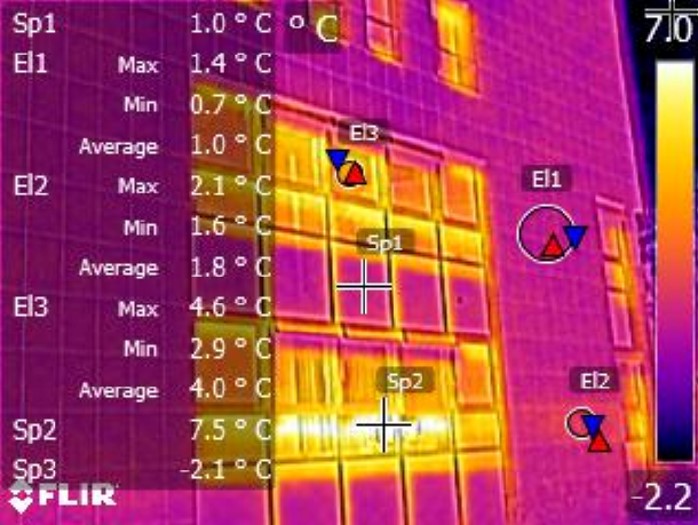 Transsolar hat den Bestand analysiert und das Komfortempfinden der NutzerInnen erfragt und Wärmebrücken identifiziert. Die U-Werte an den Fenstern liegen für die Rahmen bei 3,2 W/m²K und dem Glas bei 2 W/m²K. Obwohl der Wärmebedarf für den Standard der Gebäudehülle niedrig ist, besteht ein hoher Primärenergiebedarf. Verbrauchswerte liegen für das Heizen bei 58 kWh/m²a, für den Strom bei 51.3 kWh/m²a. Den hohen Stromverbrauch verursacht hauptsächlich die Beleuchtung. Der niedrige Wärmebedarf kann dadurch erklärt werden, dass die Stromverbraucher in den Räumen maßgeblich zur Beheizung beitragen, wobei zu bedenken gilt, dass in Anbetracht der Klimaerwärmung in Zukunft mit noch mehr Überhitzungen der Büros gerechnet werden muss.
